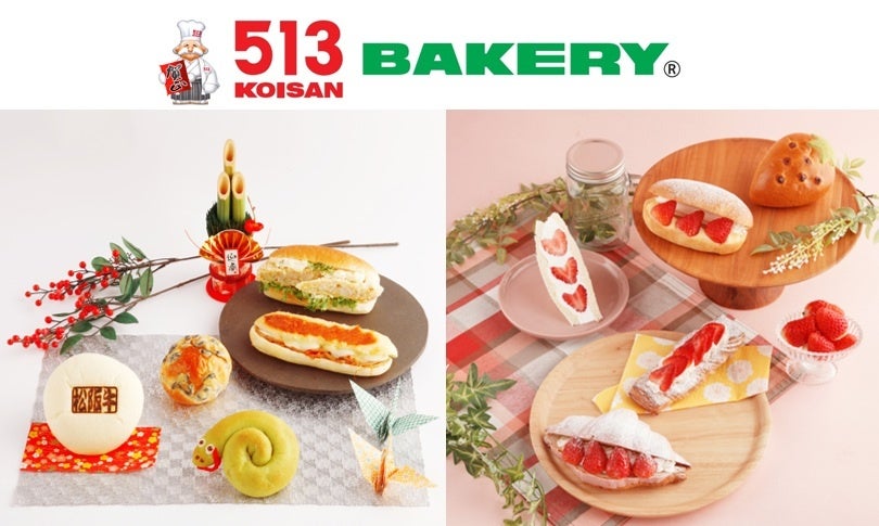三重県・愛知県・東京都・北海道で全14店舗を展開する513BAKERYは、2025年1月から「新春パン&いちごパンフェア」を開催。新春パンフェアでは、毎年恒例の干支をモチーフにした可愛いクリームパンや松阪牛のすき焼きを半熟風たまごと一緒に包んだ贅沢な惣菜パンなど、新年にふさわしいパン全5品を販売します。またいちごパンフェアでは、旬のフレッシュないちごを使ったふわふわのコッペパンやサクサクのデニッシュなど、色鮮やかで見た目も可愛いパン全5品を販売します。ぜひこの機会にお召し上がりください。