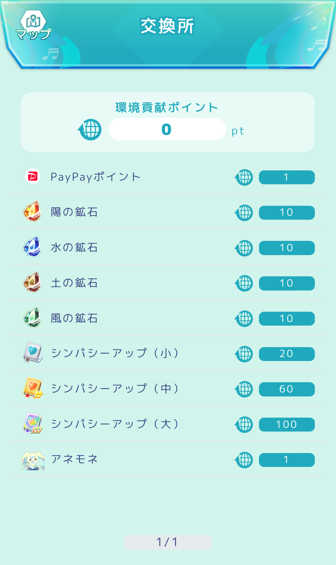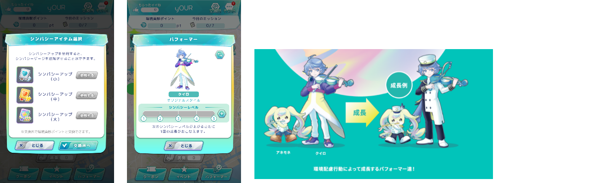 実証期間中にゲーム内で発生するさまざまなミッションをクリアすることにより、ユーザーは環境貢献ポイントを獲得できます。環境貢献ポイントはゲーム内の「メニュー」にある「交換所」で、PayPay ポイントやゲーム内アイテムと交換することが可能です。