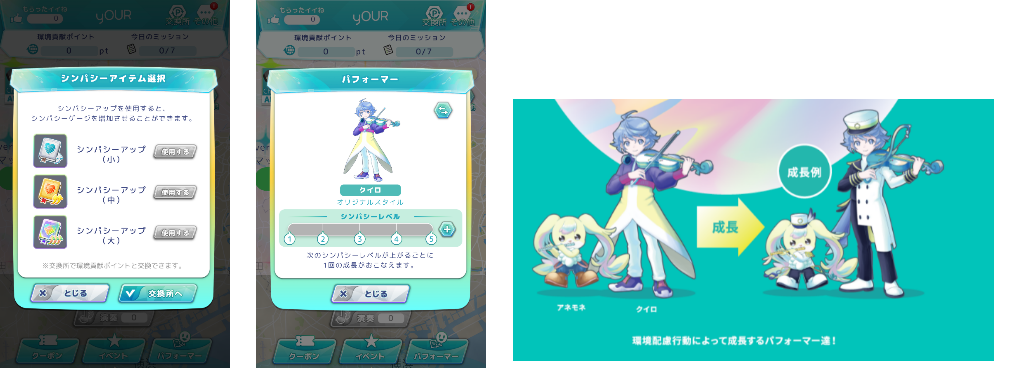 浄化活動を通じて、パフォーマーの「シンパシー」が向上します。さらに、「シンパシー」が高まったパフォーマーに浄化活動で手に入る「光の鉱石」を与えることでパフォーマーの楽器や衣装が変化し、さまざまなジャンルの音楽を演奏できるようになります。