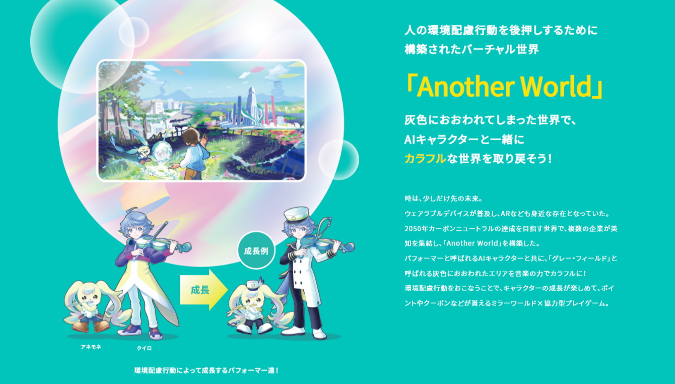 | 人の環境配慮行動を後押しするために構築されたバーチャル世界「Another World」 灰色におおわれてしまった世界で、AI キャラクターと共にカラフルな世界を取り戻す。 時は少しだけ先の未来、AR なども身近な存在となっていた。 2050 年カーボンニュートラル達成を目指す世界で、多くの企業が英知を集結し、 実世界のすべてがデジタルツインとして存在し、 人の環境配慮行動を可視化して後押しするバーチャルな世界「Another World」を構築した。 「Another World」内の人々は「パフォーマー」と呼ばれる AI キャラクターと共に、 環境汚染により灰色におおわれた「グレー・フィールド」と呼ばれるエリアを、 音楽の力によりカラフルにする。 |