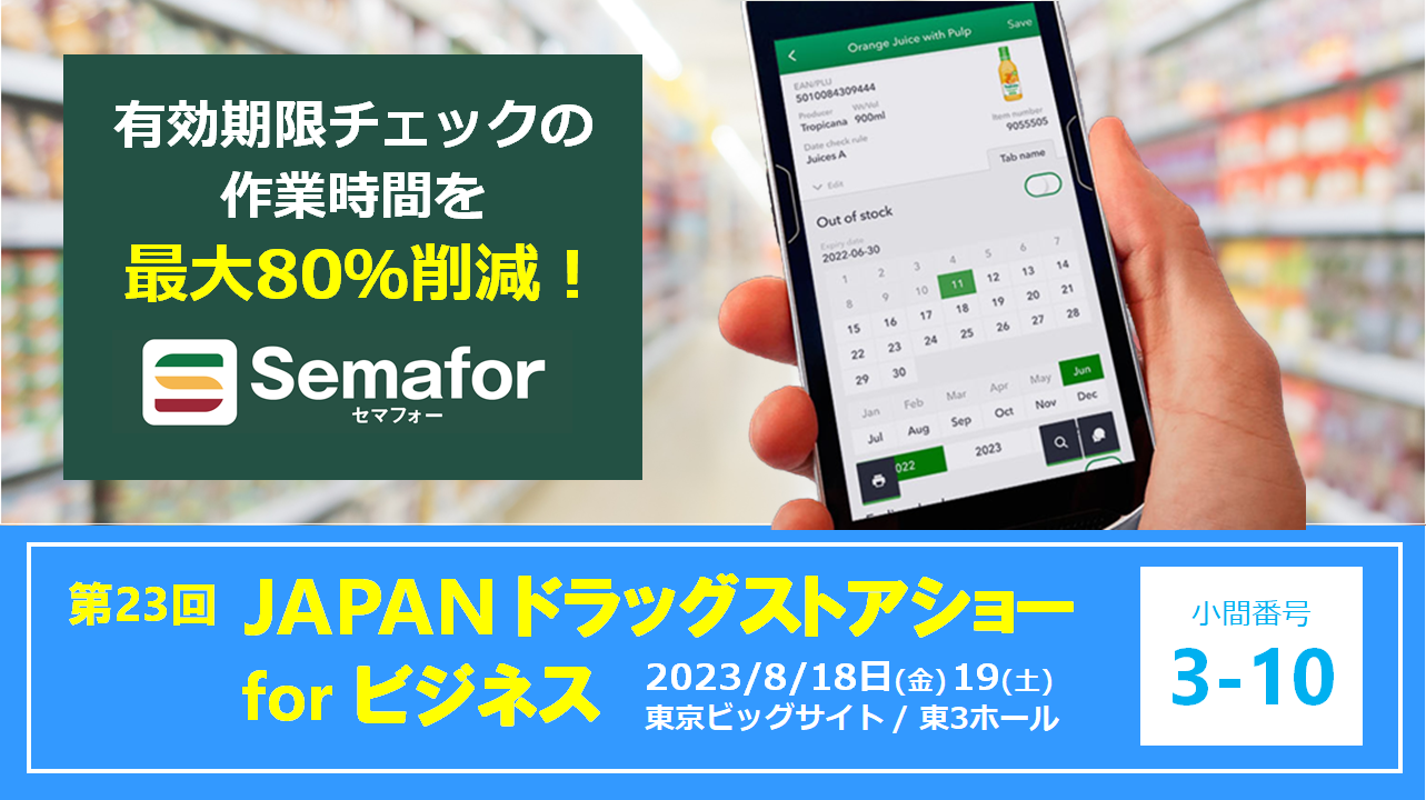 ドラッグストア各店舗では、有効期限(賞味期限や使用期限)のチェック作業に膨大な時間をかけており、それは店舗スタップの大きな負担となっています。当ブースでは、有効期限チェックの作業時間を大幅に削減し、ドラッグストアのローコストオペレーションをサポートする世界トップクラスのデジタルソリューション「Semafor」(セマフォー)をご紹介いたします。