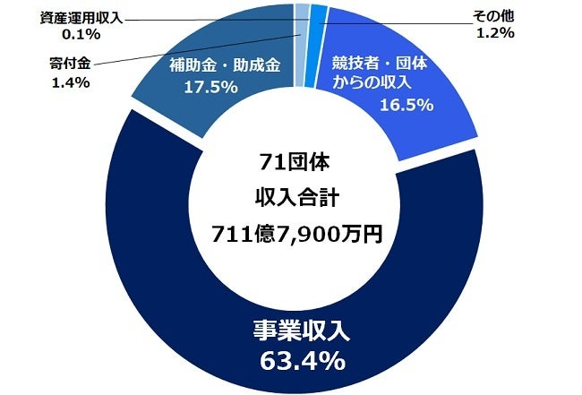 図表5は、全71団体の総収入合計711億7,900万円の科目構成比(%)を示している。「事業収入」の割合が63.4%と最も高くなっている。次いで比率の高い科目は、「補助金・助成金」の17.5%、「競技者・団体からの収入」の16.5%である。外部から調達した資金のうち、「寄付金」による収入は低く1.4%である。「資産運用収入」は、収入に占める比率が最も低い0.1%となっている。この傾向は過去2回の調査とほぼ同じ水準となっている。