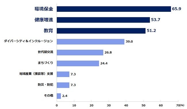 ▶活動を通じて解決を目指す社会課題では「環境保全」(65.9%)、「健康増進」(53.7%)、「教育」(51.2%)が高い割合を示した。次いで、「ダイバーシティ&インクルージョン」(39.0%)、「世代間交流」(26.8%)、「まちづくり」(24.4%)と続く。