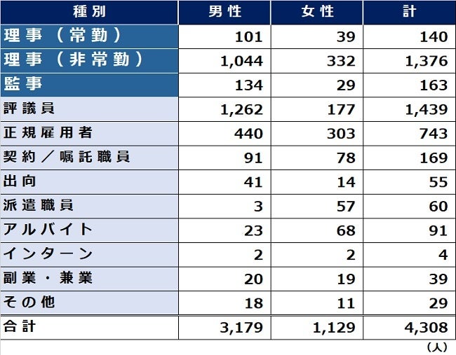 役員の人数を全体(4,308人)に対する割合でみると、理事(常勤)が3.2%、理事(非常勤)が31.9%、監事が3.8%と、理事(非常勤)の割合が飛び抜けて高く多くの理事(非常勤)が存在していることがわかる。