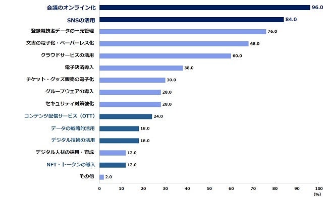 一方、「コンテンツ配信サービス(OTT)」(24.0%)や「データの戦略的活用」(18.0%)、「デジタル技術の活用」(18.0%)、「NFT・トークンの導入」(12.0%)というように、割合としては多くはないが、新しい収益源となる可能性があるDX化・テクノロジーの活用の兆しがみえる。