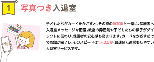 子どもたちがカードをかざすと、その時の顔写真と一緒に、保護者へ入退室メッセージを配信。