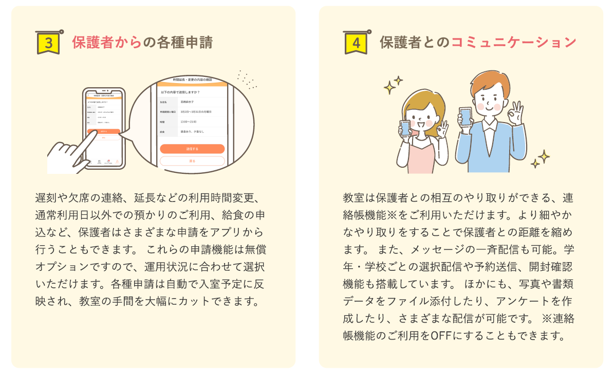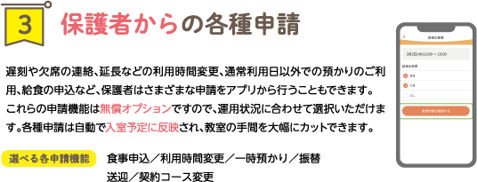 遅刻や欠席の連絡、延長などの利用時間変更、通常利用日以外での預かりのご利用、