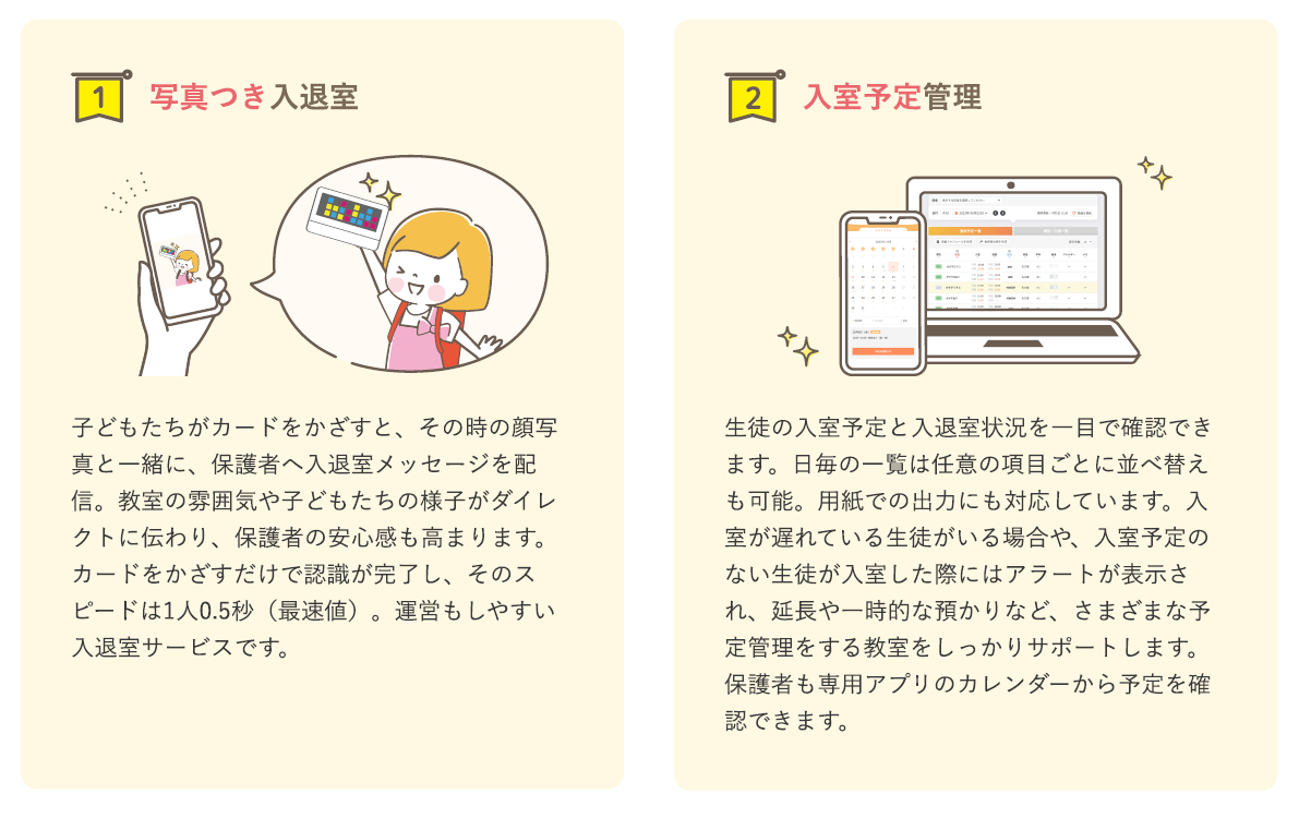 写真つきの入退室管理&多彩な教室管理機能により、日々の教室運営をサポート。