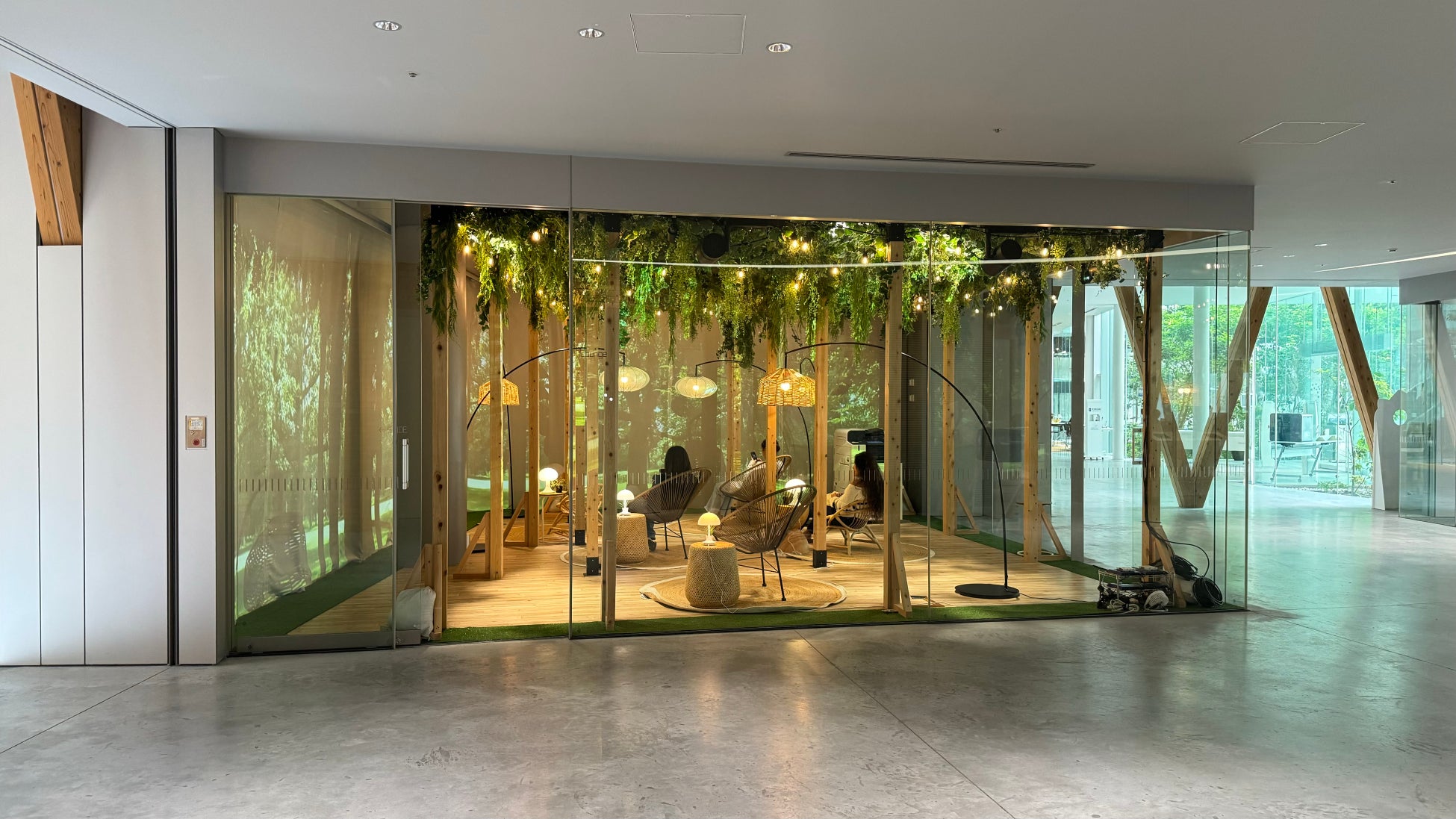 壁面には「森」の映像、床面には人工芝を敷くなどにより、快適性や生産性の向上を誘発する空間を演出し、実際の効果を検証していきます。
