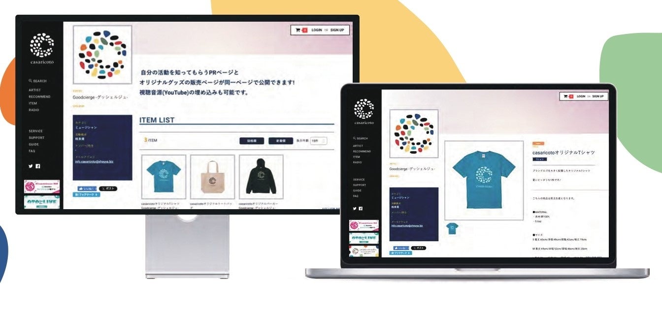 制作したオリジナルグッズは、casaricoto(アーティストグッズECサイト)のサイトページで出品するので、グッズPRと販売を一つのプラットフォーム内で完結可能です。また、売れた分だけ作成する完全受注販売形式なので、在庫を抱えてしまう必要がないので、在庫リスクを解消できます。また、Goodciergeは受注が1枚だけでも販売が可能な、昨今にあったオンデマンドサービスです。