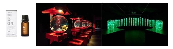 清潔な空気環境をつくるユーカリを中心にブレンドした香りでは、日本の寺社仏閣に見られる風景を表現した“金魚の回廊”の作品エリアを演出しています。