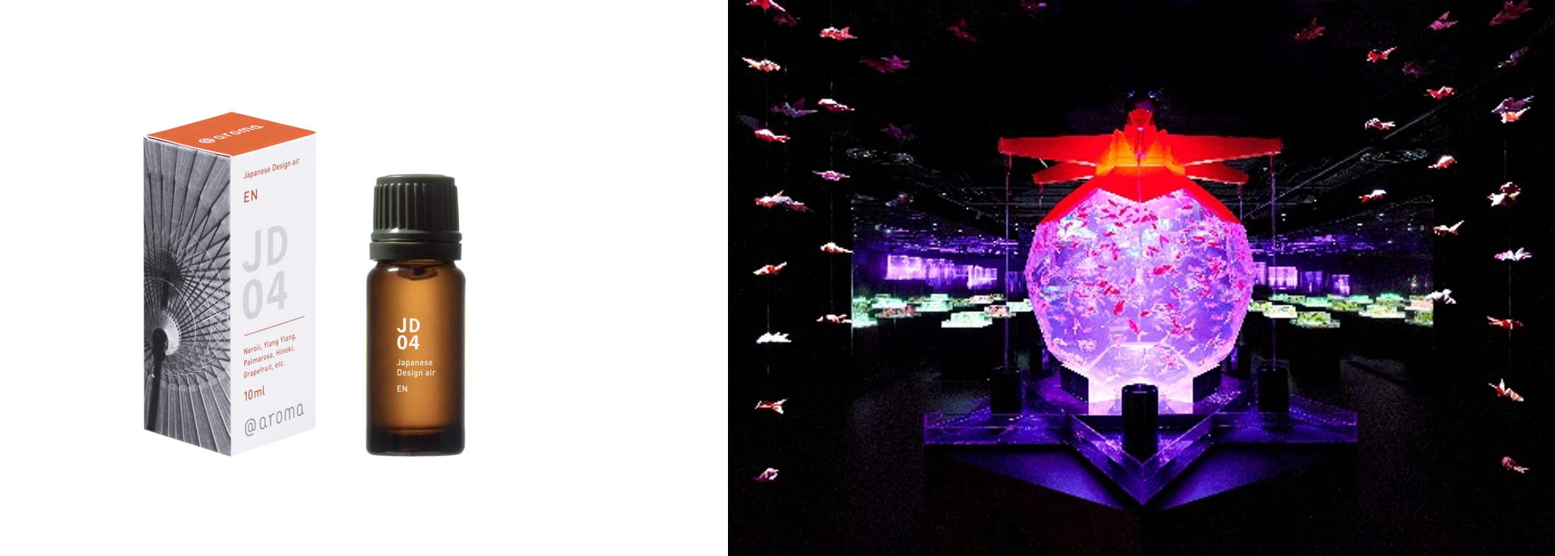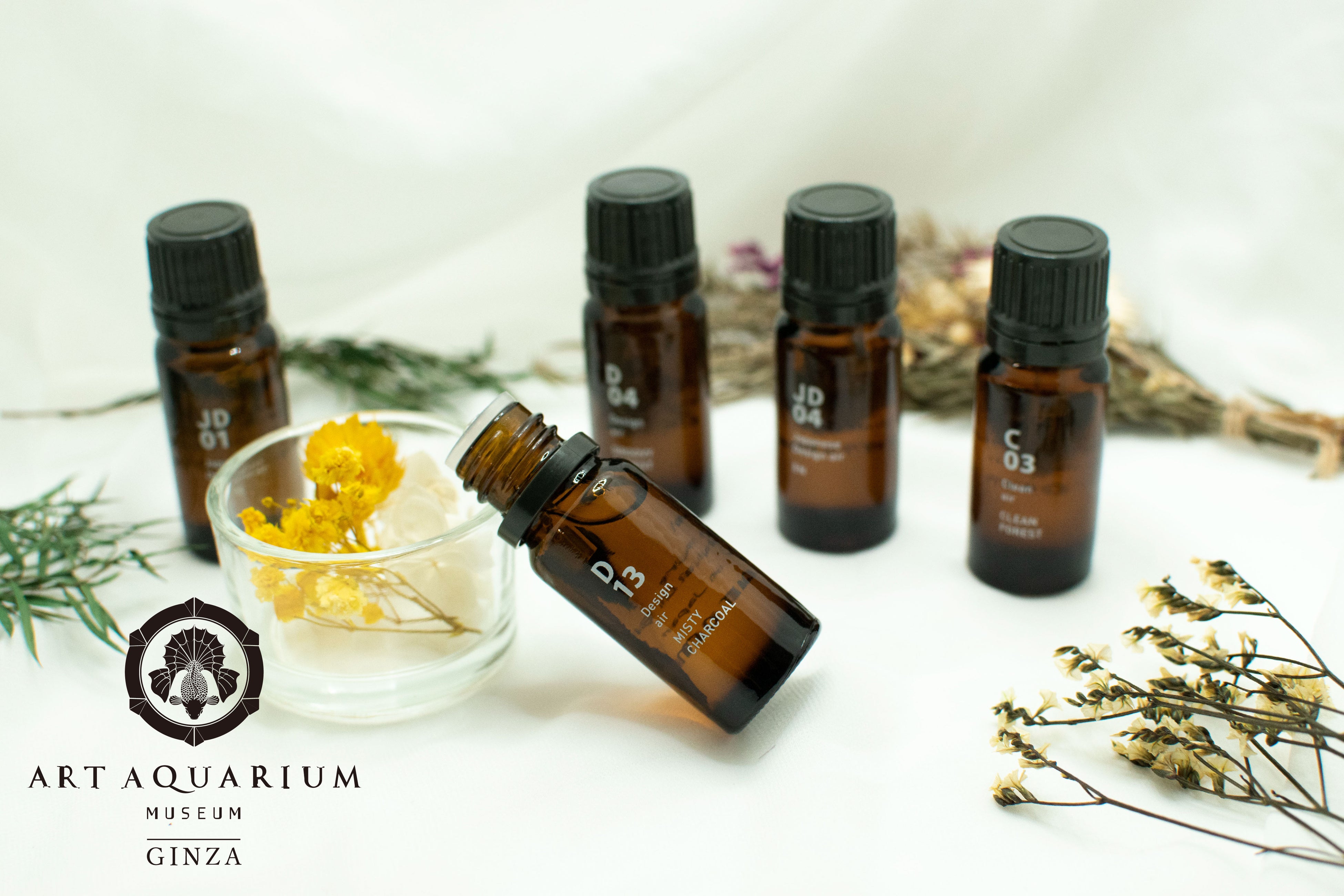 金魚が泳ぐ水槽作品を光彩と音楽、そして香りで演出するアートアクアリウム。アートアクアリウム美術館 GINZAの館内は、作品エリアごとにそれぞれのイメージに合わせた香りで空間を演出しています。アートアクアリウムの幻想世界を構成する大切な要素である香りを、ご自宅でもお楽しみいただくことができるこの機会に、ぜひご体験ください。