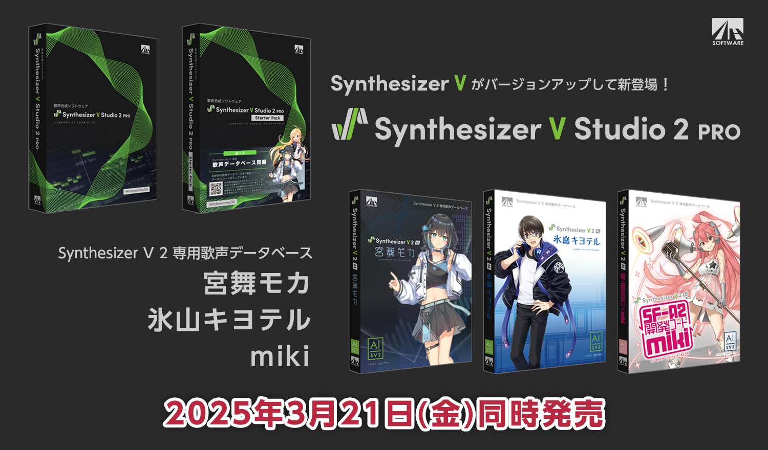 3月21日に発売するシリーズ最初のソフトは、歌声合成ソフト『Synthesizer V Studio 2 Pro』、エディターにお好きな歌声データベースをダウンロードできるクーポンが付属した『Synthesizer V Studio 2 Pro スターターパック』、Synthesizer V 2専用歌声データベース『Synthesizer V 2 AI 宮舞モカ』『Synthesizer V 2 AI 氷山キヨテル』『Synthesizer V 2 AI miki』の5タイトルとなります。