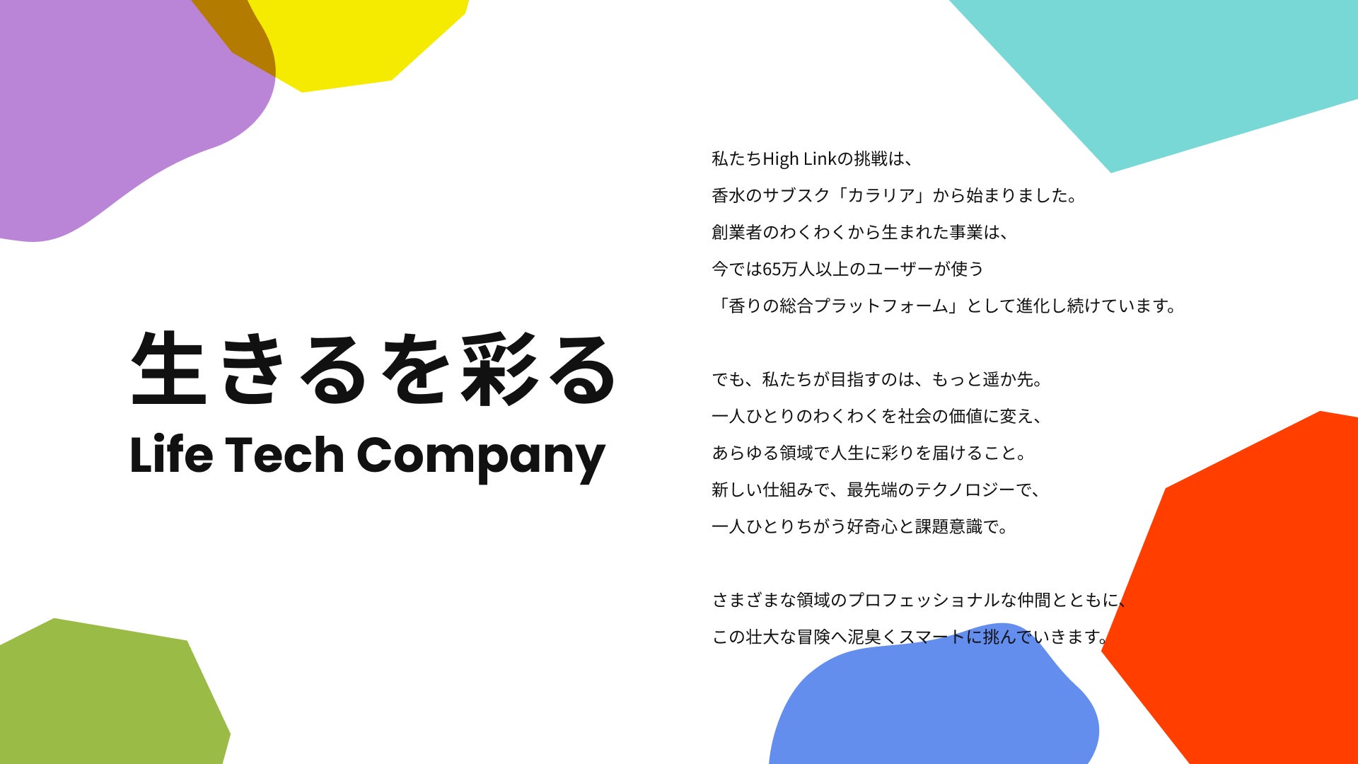 香水のサブスクとして「カラリア」から始まった私たちが目指すのは、もっと遥か先。世界中の誰もが使うような、とんでもなく大きな価値を持つプロダクトを生み出したい。世界で一番、幸せ/happyの総量を増やせる会社になりたい。