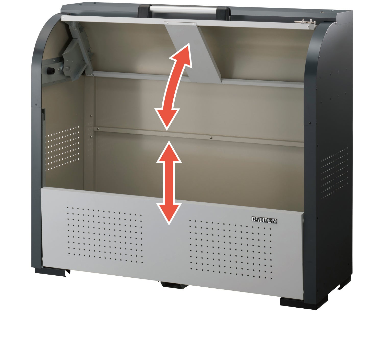上部の扉は本体内部に納まる回転式、前扉は前面にスペースがなくても開閉可能な上下スライド式を採用。限られた設置環境でも、空間を有効に活用します。