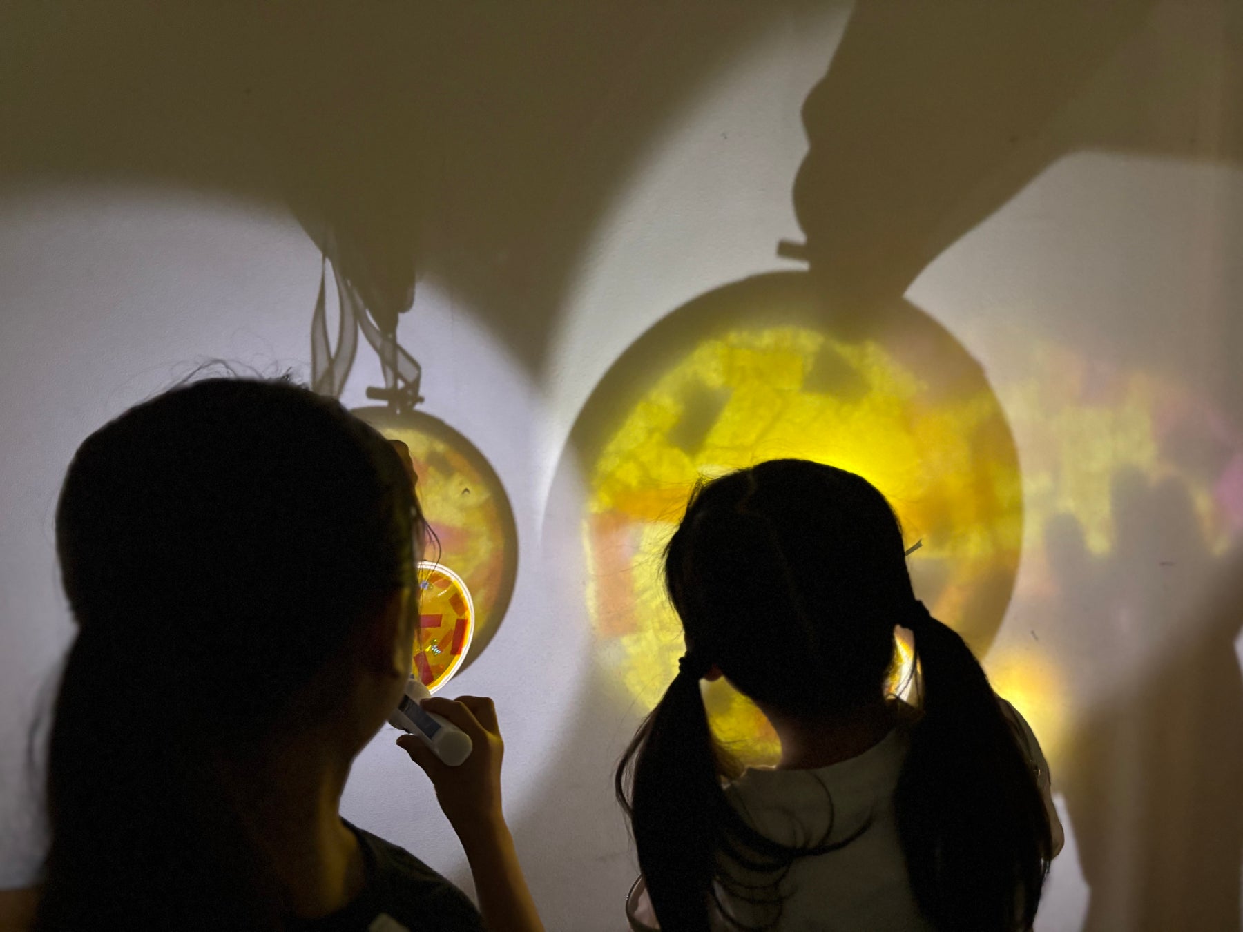 セロハンをペタペタ貼ったり、うさぎのシルエットを型どったりして、オリジナルの満月を完成させました。クラフトを真っ暗なお部屋で照らすと、浮かび上がる満月!満月の中に映るうさぎの影に、子どもたちは大興奮でした。