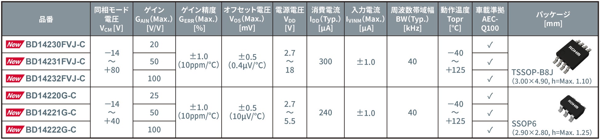 ローム株式会社(本社:京都市)は、車載信頼性規格AEC-Q100(*1)準拠の高精度電流センスアンプ「BD1423xFVJ-C」および「BD1422xG-C」を開発しました。TSSOP-B8Jパッケージを採用する「BD1423xFVJ-C」は、+80Vの入力電圧に対応しており、48V電源で駆動するDC-DCコンバータ、冗長電源、補機バッテリー、電動コンプレッサなどの高電圧環境向けに適しています。ゲイン設定別に「BD14230FVJ-C」「BD14231FVJ-C」「BD14232FVJ-C」の3機種を用意しています。また、小型のSSOP6パッケージを採用する「BD1422xG-C」は、+40Vの入力電圧に対応しています。ボディやドライブ系ドメインで使用される5V/12V駆動の電源ネットワークにおける電流監視や保護(過電流検出)など、省スペース設計が求められる車載機器に最適です。こちらもゲイン設定別に、「BD14220G-C」「BD14221G-C」「BD14222G-C」の3機種をラインアップしています。