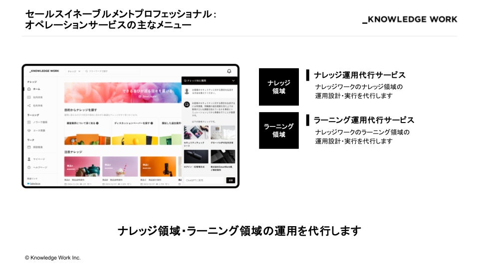 営業組織が成果を上げるためには、組織としてのセールスイネーブルメントが不可欠です。しかし、リソース不足により、セールスイネーブルメントの実現が難しい企業も多く存在します。ナレッジワークのオペレーションサービスは、ナレッジワークの運用のリソースを提供し、泥臭く、並走しながら、企業の状況に最適な形でセールスイネーブルメントの実現をサポートします。ナレッジワークは、営業組織の成長を支援する真のパートナーとして、これからも企業の営業変革を強力に後押ししてまいります。