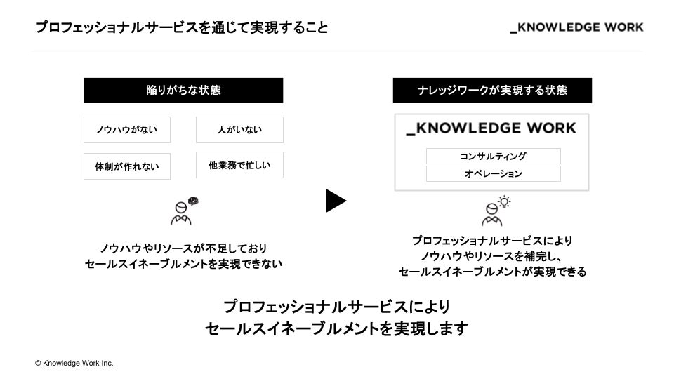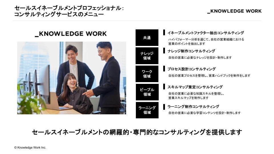 長らくセールスイネーブルメントに関わってきましたが、セールスイネーブルメントは米国などで実績を上げている強力な営業支援メソッドであるにも関わらず、国内の多くの企業でそのノウハウが不足しており、営業組織で実践することができていません。ナレッジワークのコンサルティングサービスは、各社に合ったイネーブルメントの仕組みづくりを伴走してご支援することが可能です。これまで国内、グローバルを通じて培った専門知見を元に、お客様の変革をパートナーとしてご支援できればと考えております。