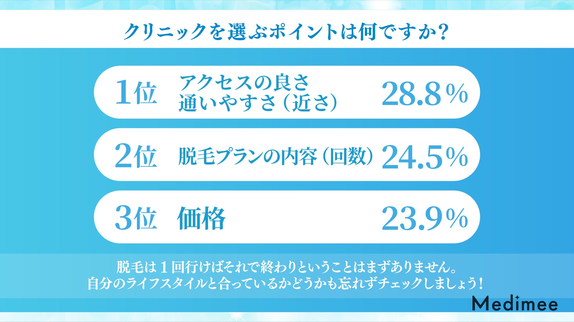脱毛経験者がクリニック選びで一番重視するポイントは、「アクセスの良さ・通いやすさ(近さ)」が最も多い結果となりました。