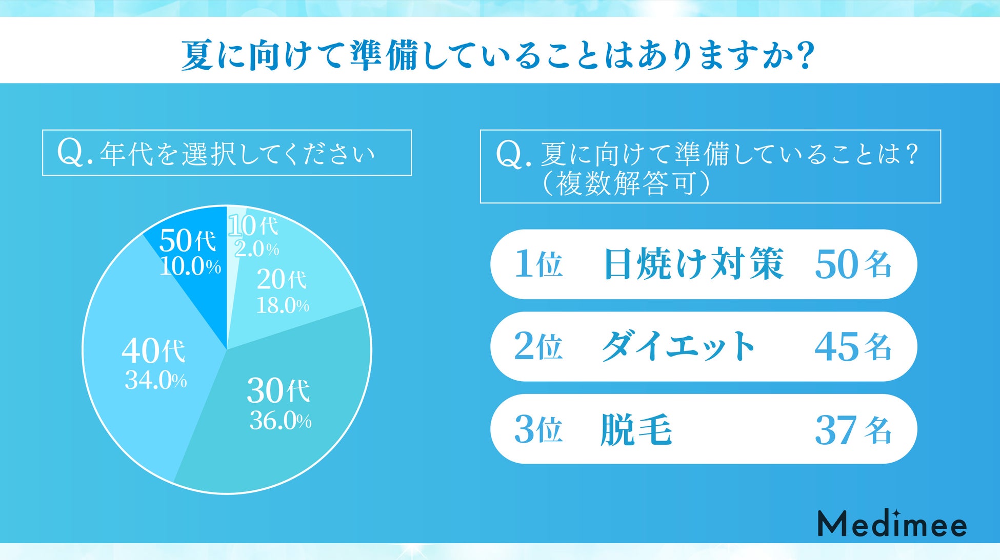 アンケート回答者の多くが、肌を露出する機会の多くなる夏に向けて、「日焼け対策」「ダイエット」「脱毛」など美容に関する対策を行っていることが分かりました。