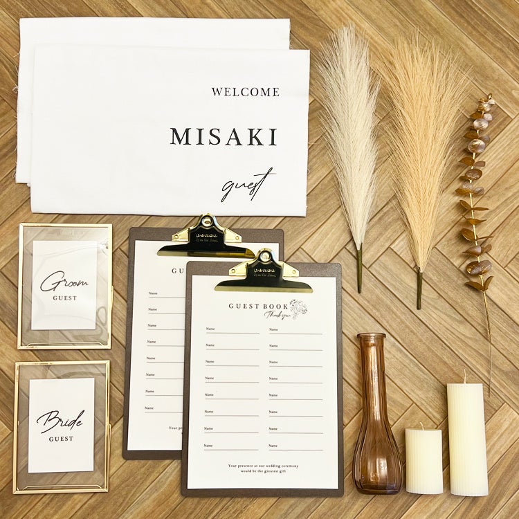 お二人の名前が入っているタペストリーや受付サイン、ゲストのお名前をご記帳していただく芳名シートなどの受付に必要なアイテムがひとつになっている完璧なセットです。