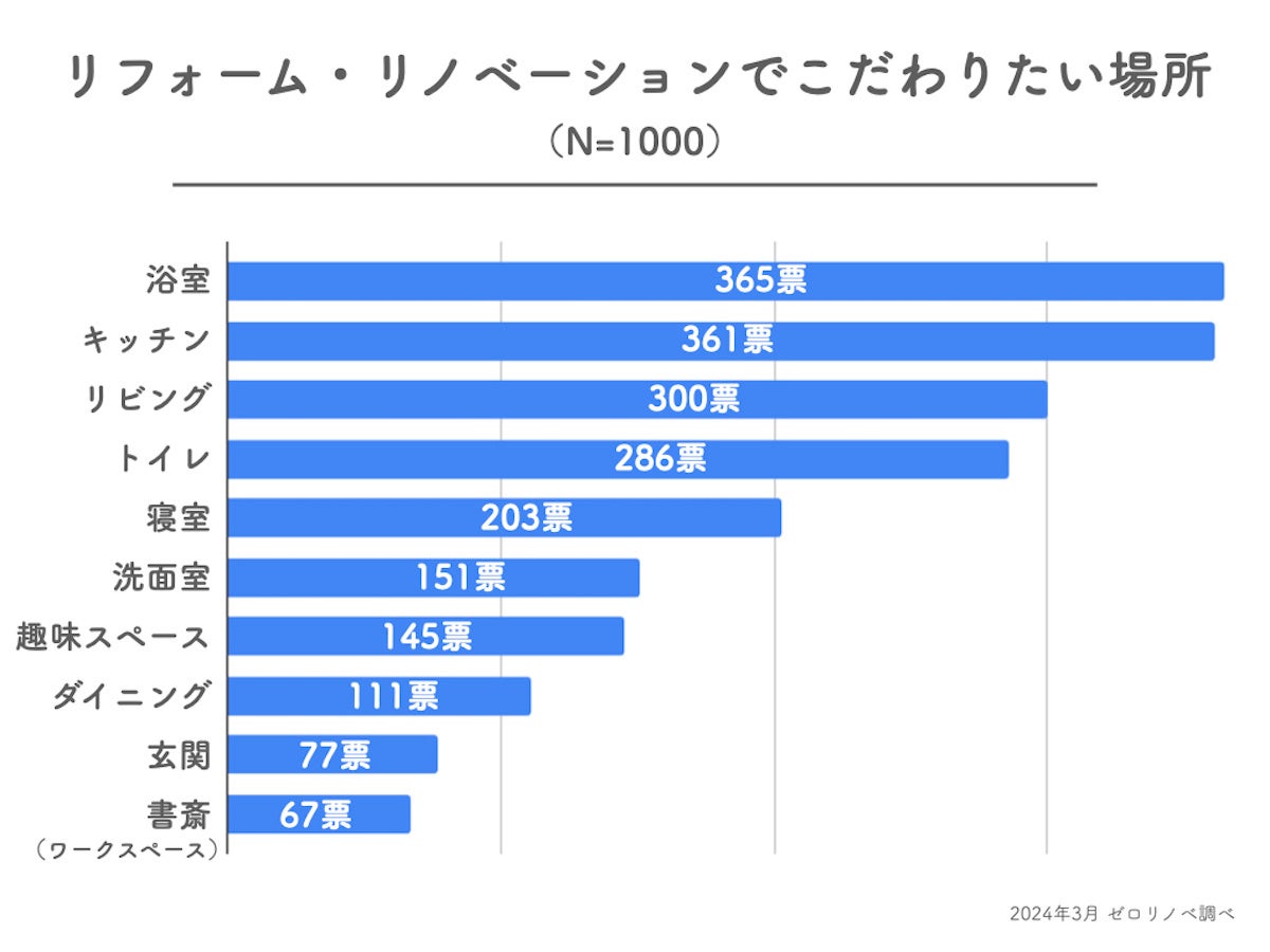 2023年6月、既婚者を対象に行った調査では、リビングが535票で第一位だったのに対し、ひとり住まいの方を対象にした本調査では、浴室が365票で第一位となりました。