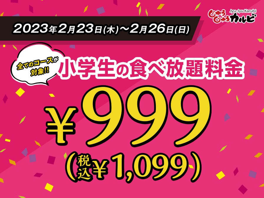 株式会社トマトアンドアソシエイツ(本社:兵庫県西宮市、代表取締役社長:小林 大二)が運営する、焼肉食べ放題「じゅうじゅうカルビ」では、2023年2月23日(木)~2月26日(日)の4日間、全てのコースで対象になる『食べ放題 小学生料金999円』で販売いたします。