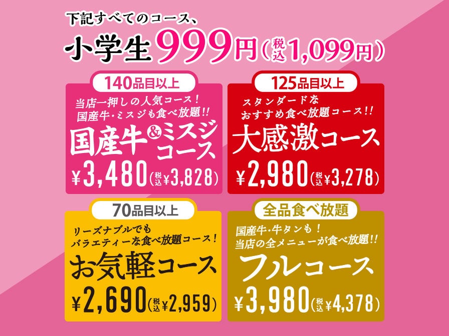 【4日間限定】焼肉食べ放題、小学生料金が999円(税込1,099円)に!全コースが対象