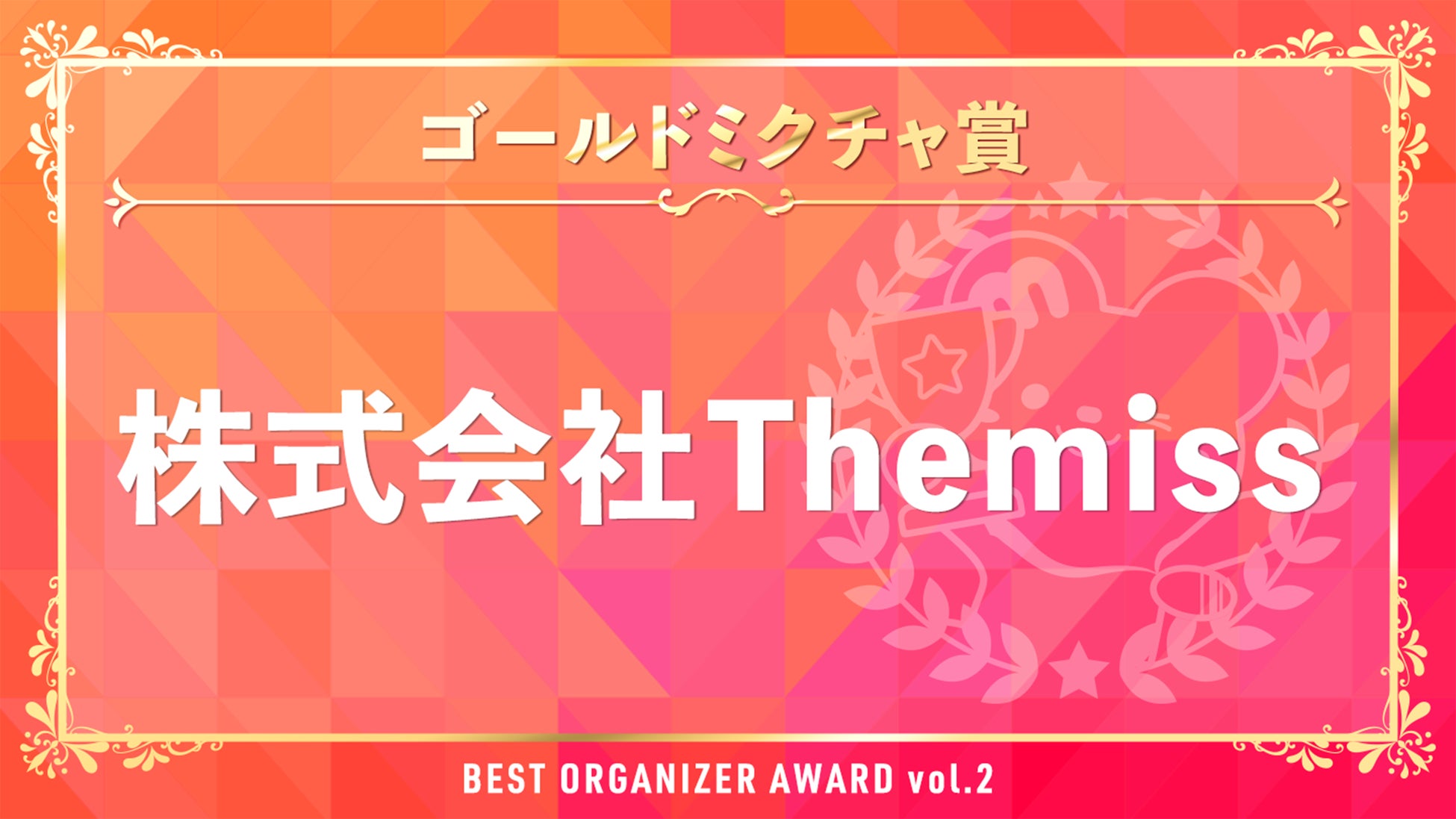株式会社Themiss(東京都港区、代表取締役:板谷 瞭太郎)は、株式会社DONUTS(本社:東京都渋谷区、代表取締役:西村 啓成)が開発・運営するライブ配信&動画アプリ「ミクチャ」の「ミクチャ BEST ORGANIZER AWARD vol.2」にて「ゴールドミクチャ賞」を受賞いたしました。