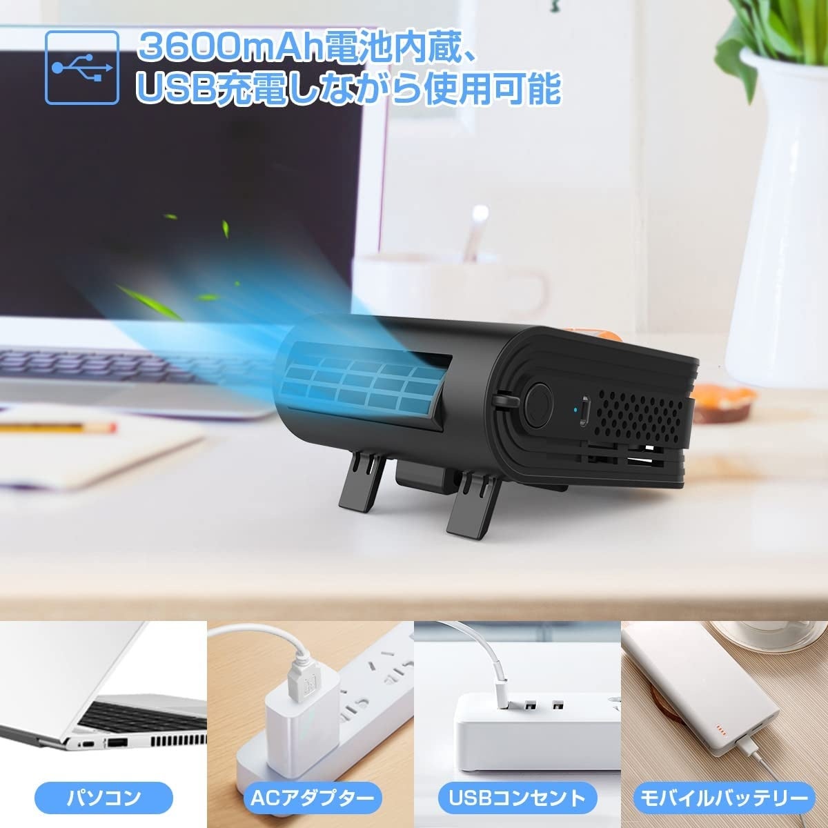 風量は弱、中、強の3段階で調節が可能、角度が手動で調整できますので、暑さの度合いによって自由に風の強さと風向きの変更ができます。こまめに風量モードを切り替えることにより無駄な電力消費が抑えられます。3600mAhの大容量電池を内蔵し、USB充電方式を採用しています。パソコン、モバイルバッテリー、アダプターなどで簡単に充電ができます。約3.5Hの充電で最小風量モードでは約12時間の連続使用、最大風量モードでも約3時間の連続使用が可能です。