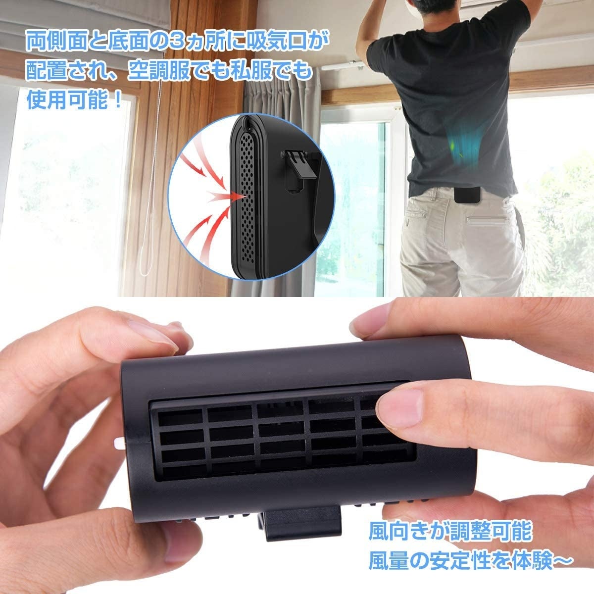 背中冷え効果抜群:フックでズボンに固定し、服が吸気口を覆わないように、背中を効果的に涼しくさせることができます。