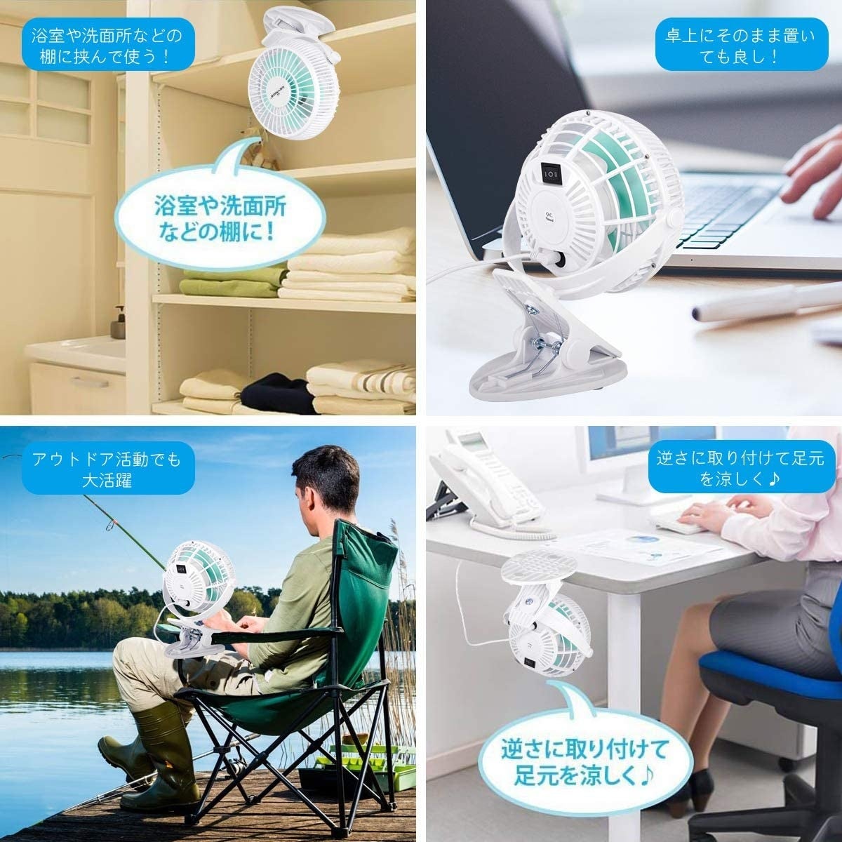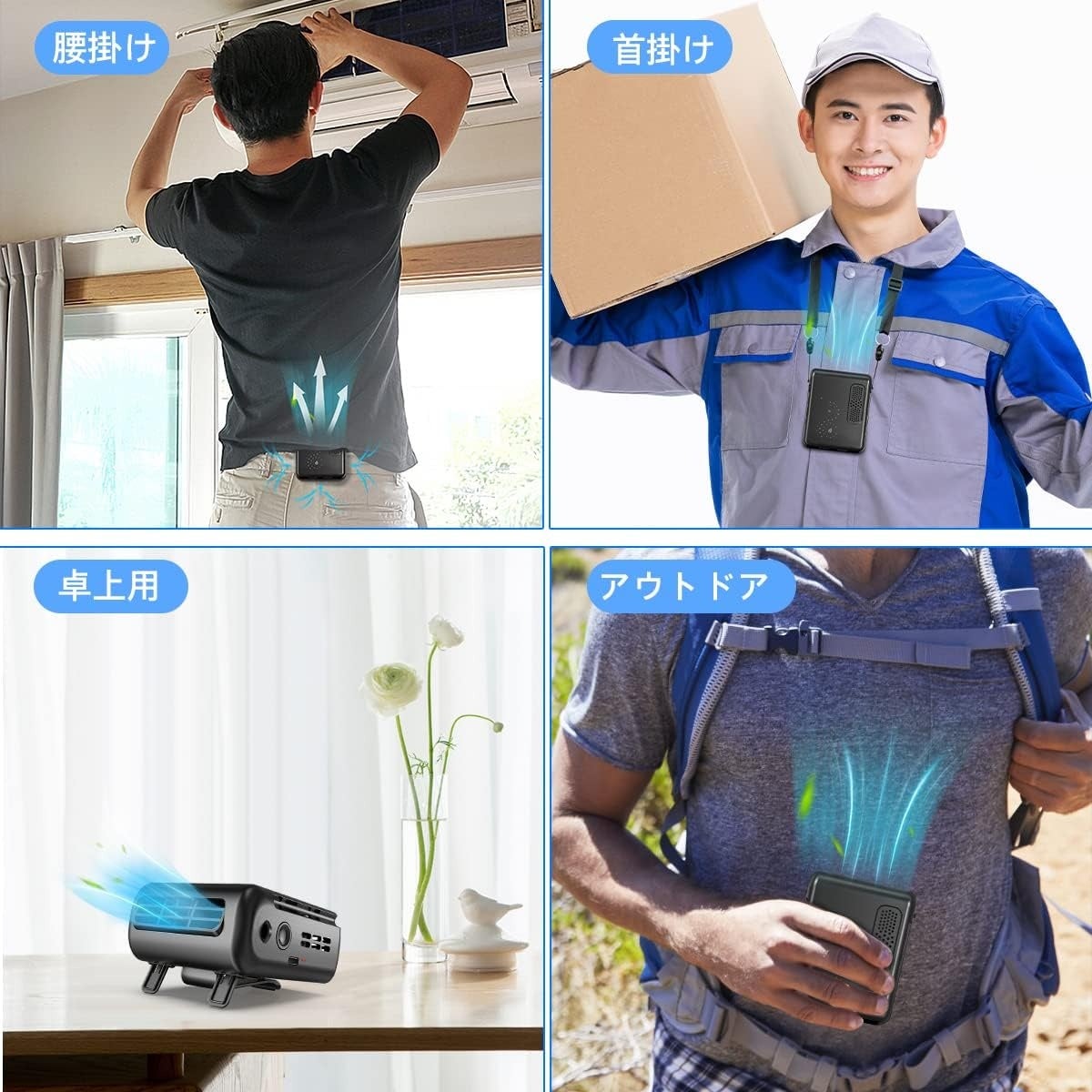 オフィスや自宅でデスク周りに使用するだけでなく、通勤通学、工事現場、農作業、配達作業、倉庫、スポーツ観戦、散歩、登山、遠足、お祭り、花火大会などのアウトドア活動様々なシーンで熱中症対策品として大活躍です。