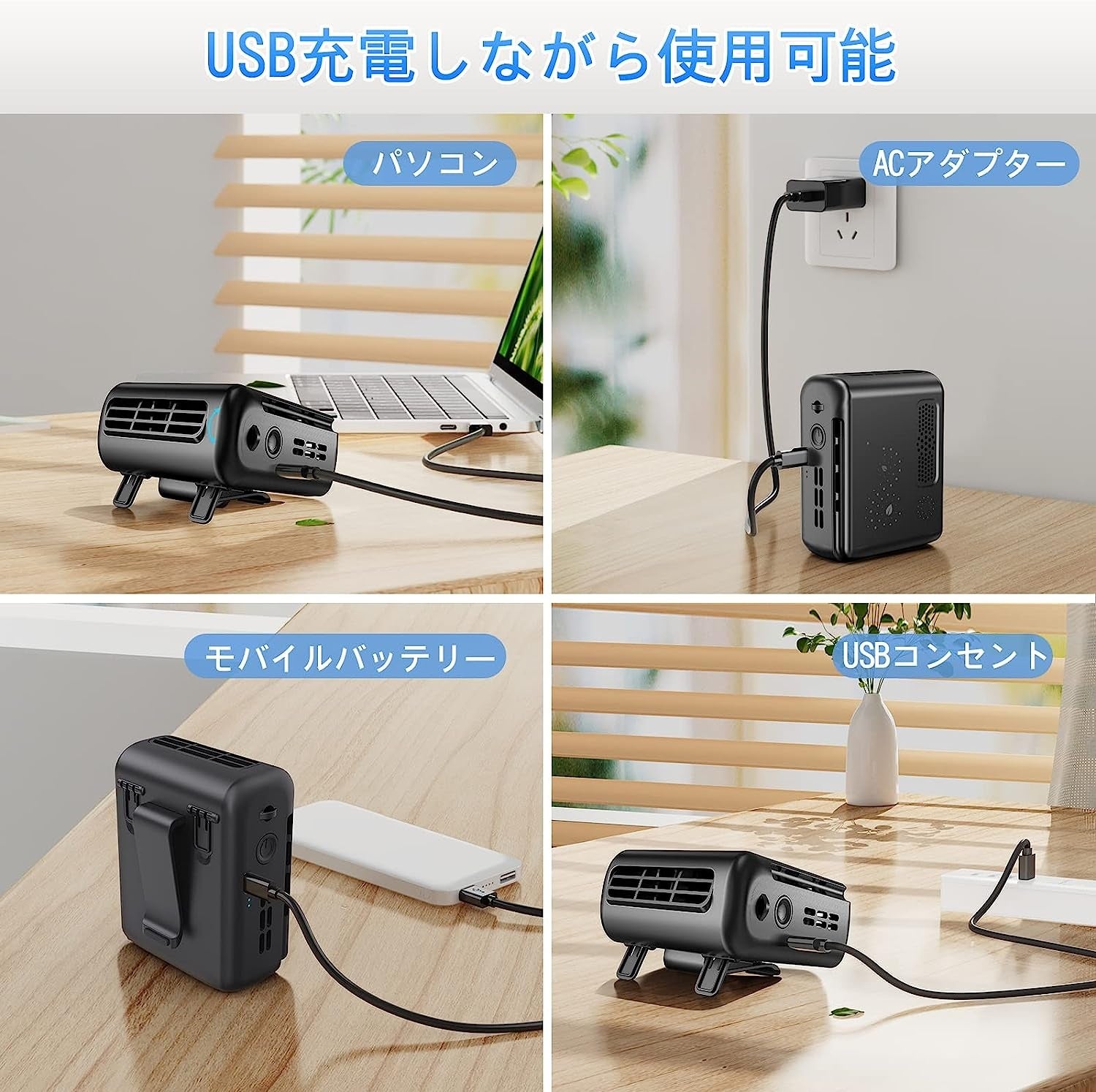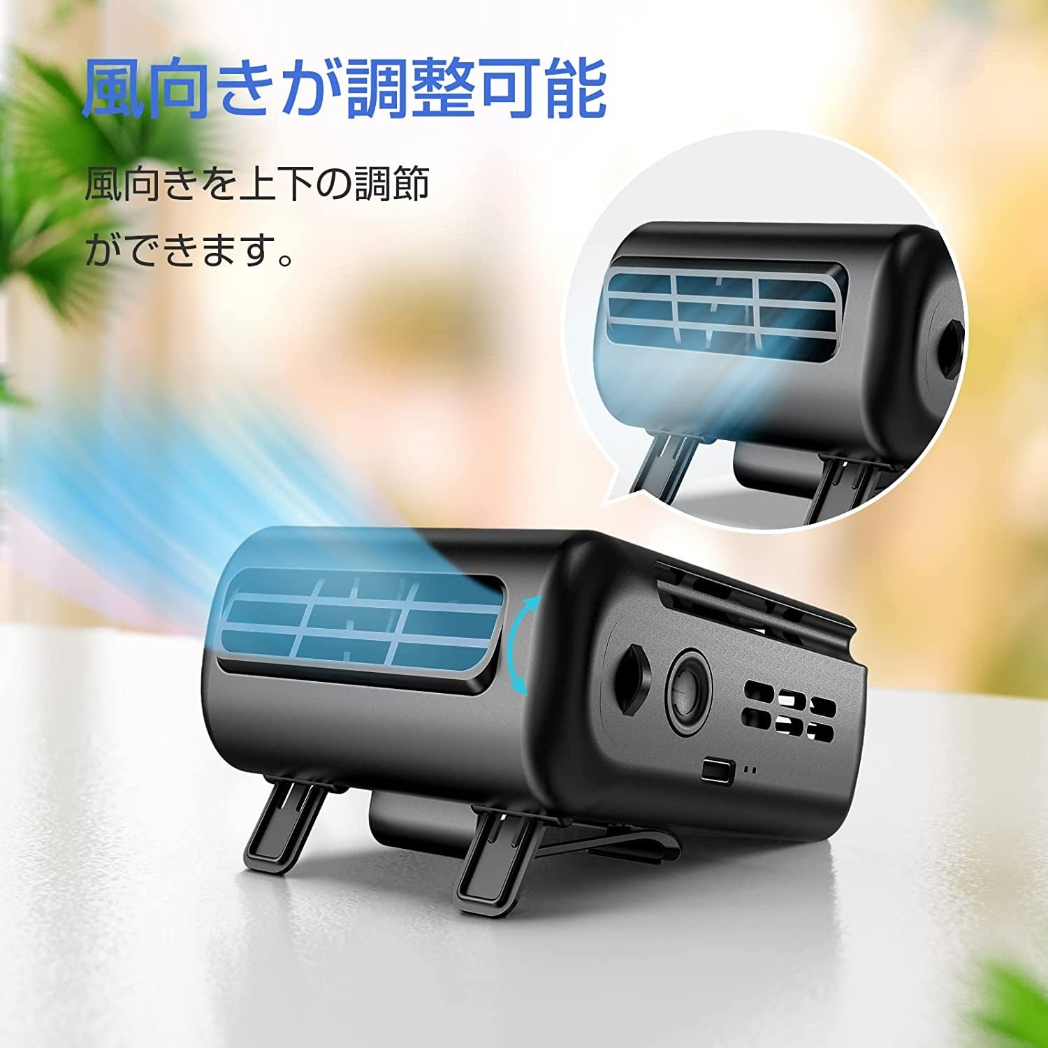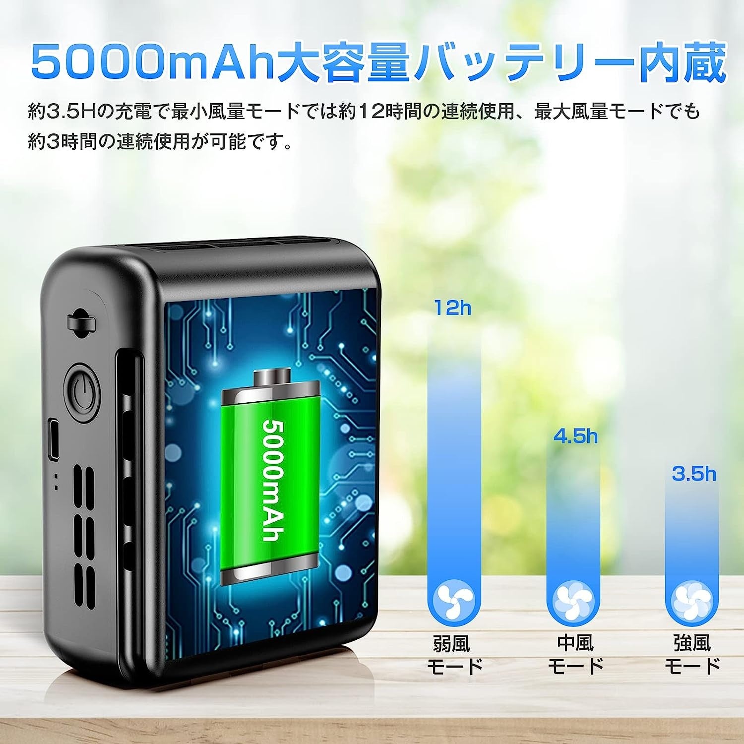 5000mAhの大容量電池を内蔵し、約3.5Hの充電で最小風量モードでは約12時間の連続使用、最大風量モードでも約3時間の連続使用が可能です。吹き出し口の角度は手動で調整可能、風向きの微調節ができます。お好みと設定位置によって、風向きの変更ができます。
