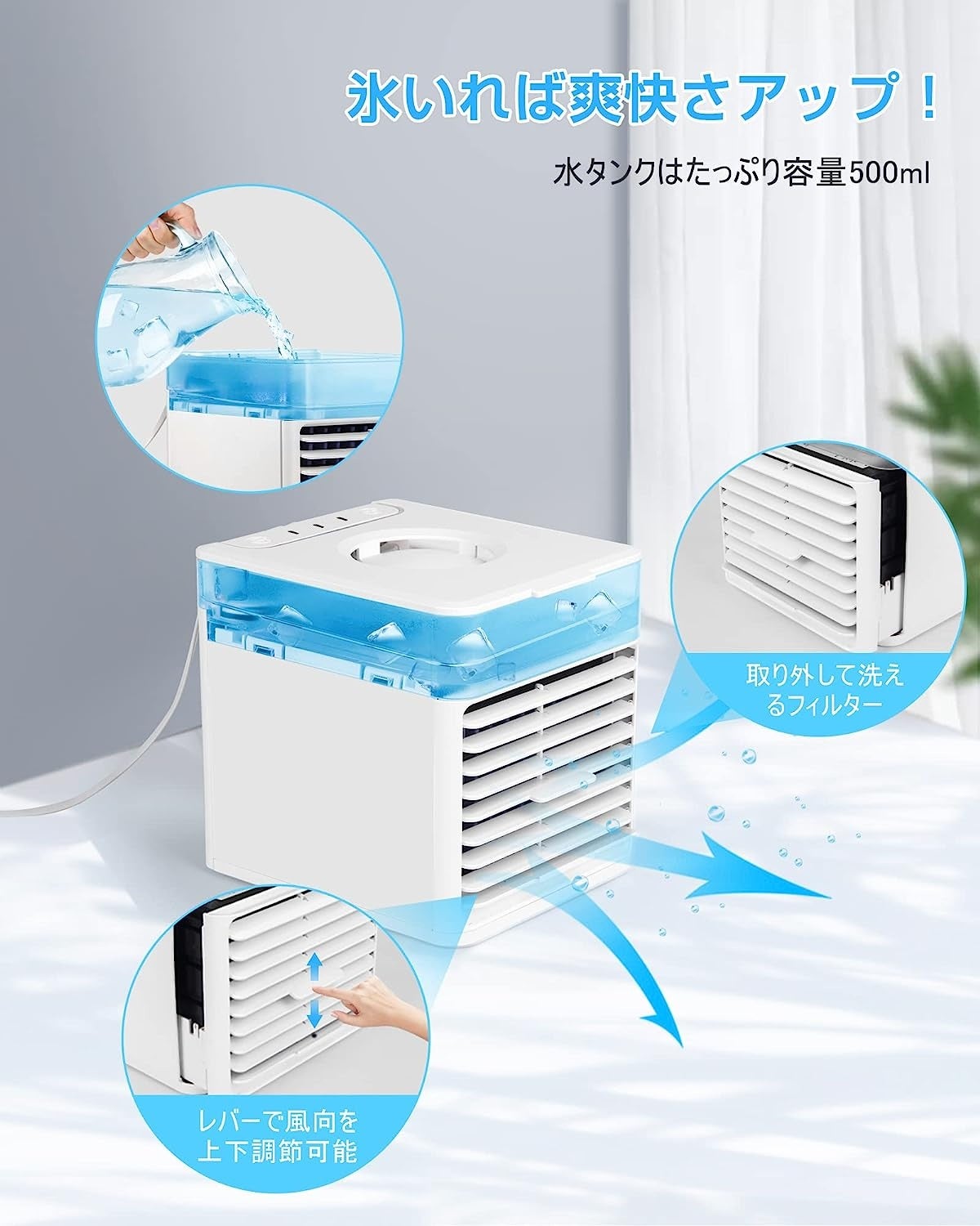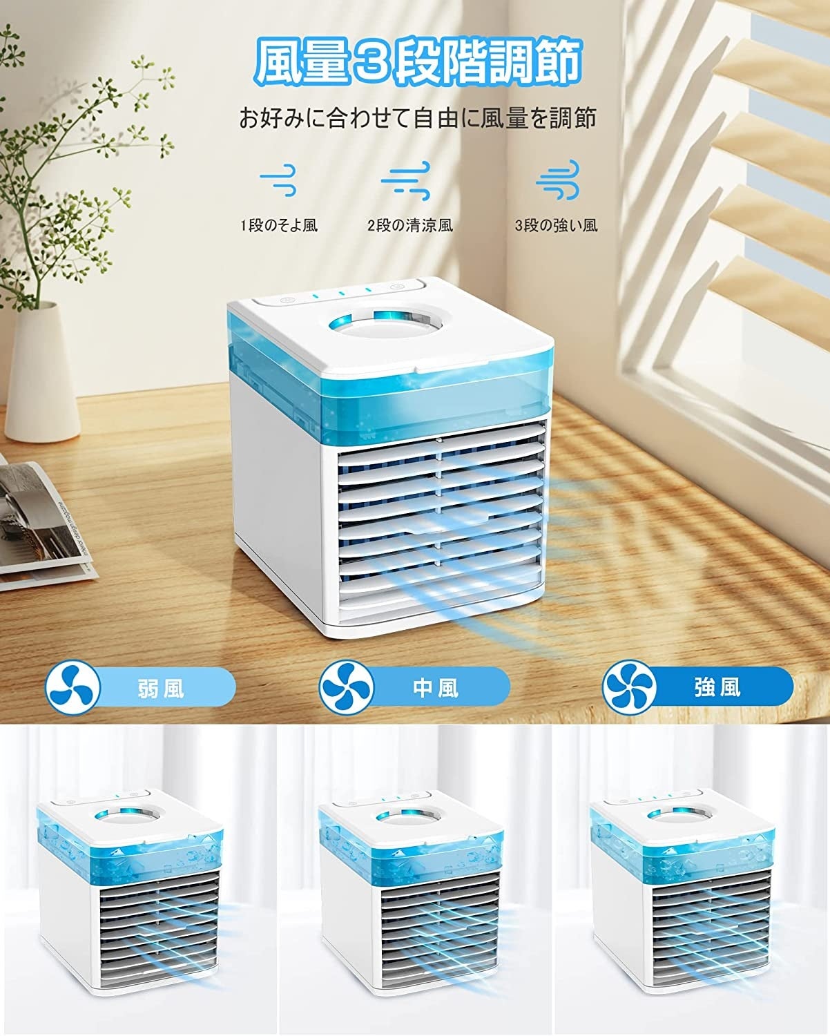 冷却・加湿・空気浄化・夜間7色ライト,4in1機能を同時に備え卓上冷風機です。