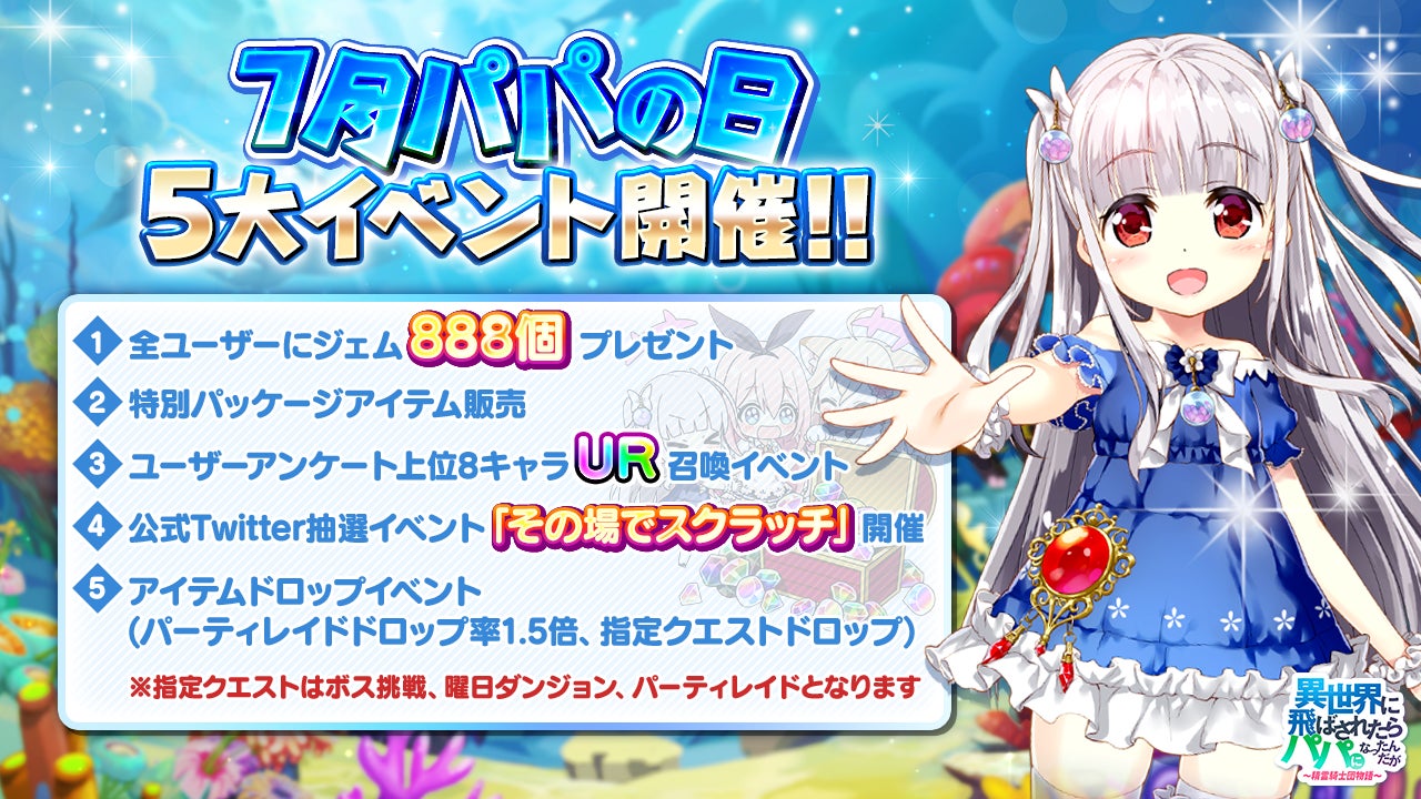 Twitterで話題の人気スマホゲーム『異世界のパパ』7月もパパの日5大イベント開催!恒例のジェムプレゼント/限定パッケージ/UR召喚ガチャ/ドロップイベント/スクラッチイベント!