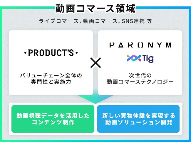 これにより、従来の博報堂プロダクツやNTMの専門性と実施力に加え、パロニムの動画コマーステクノロジーを掛け合わせたサービスを提供することが可能となり、「Tig」独自の動画視聴データを活用したコンテンツ制作や、新しい買物体験を実現する動画ソリューションの開発などで、クライアントのECビジネスに貢献してまいります。
