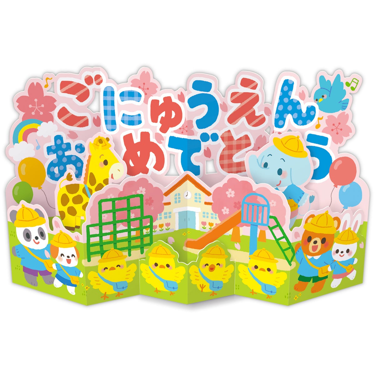 園児スタイルの可愛い動物たちが元気いっぱいに新生活をお祝い! 「ごにゅうえんおめでとう」の大きな文字が目をひく、ワクワク感たっぷりの立体カードです。