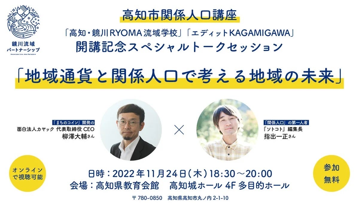 株式会社ソトコト・プラネット(本社:東京都渋谷区、代表取締役:指出一正)は、高知市環境部新エネルギー・環境政策課からの委託事業「令和4年度 鏡川流域関係人口創出・拡大業務」の一環として「高知・鏡川 RYOMA流域学校」第2期を開講します。
