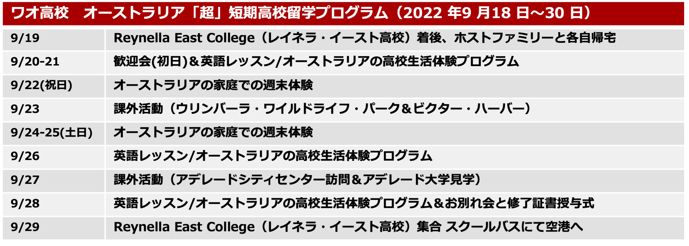激動の時代を生き抜く力を、実学と教養によって育む、学校法人ワオ未来学園ワオ高等学校(本校所在地岡山県岡山市 校長山本潮)(以下ワオ高校)は、2021年4月開校。好きな時間に好きな場所で学ぶことができる完全オンラインの学校として、未来型の学びを提供しています。このたび、ワオ高校の提携先である、南オーストラリア州の州⽴⾼校Reynella East Collegeにて、「超」短期⾼校留学プログラムを、9 ⽉18 ⽇〜30 ⽇に実施しましたので、ご報告いたします。
