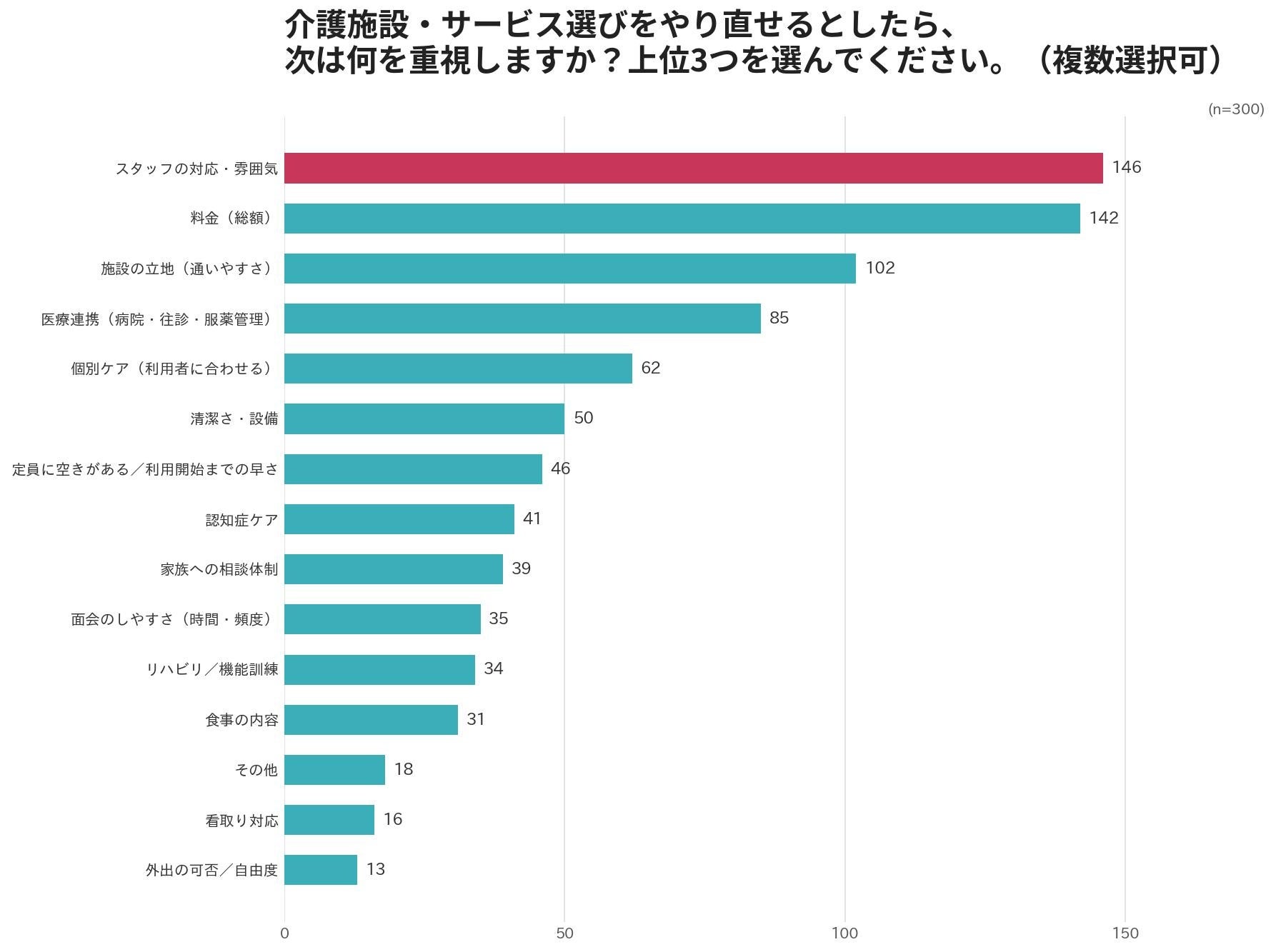 一方、「介護施設・サービス選びをやり直せるとしたら、次は何を重視しますか?」という問いでは、「スタッフの対応・雰囲気」146回答(48.7%)が首位に浮上し、「料金(総額)」142回答(47.3%)と逆転しました。