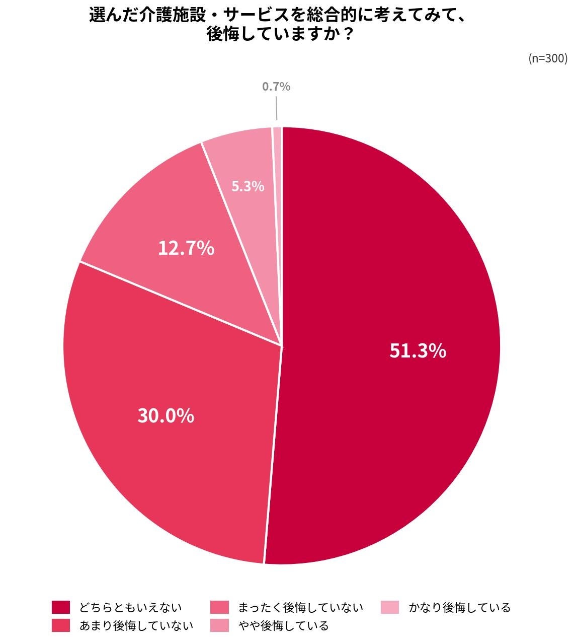 選んだ介護施設・サービスを総合的に考えて後悔しているか聞いたところ、「あまり後悔していない」30.0%(90名)、「まったく後悔していない」12.7%(38名)を合わせると、後悔なしは42.7%でした。