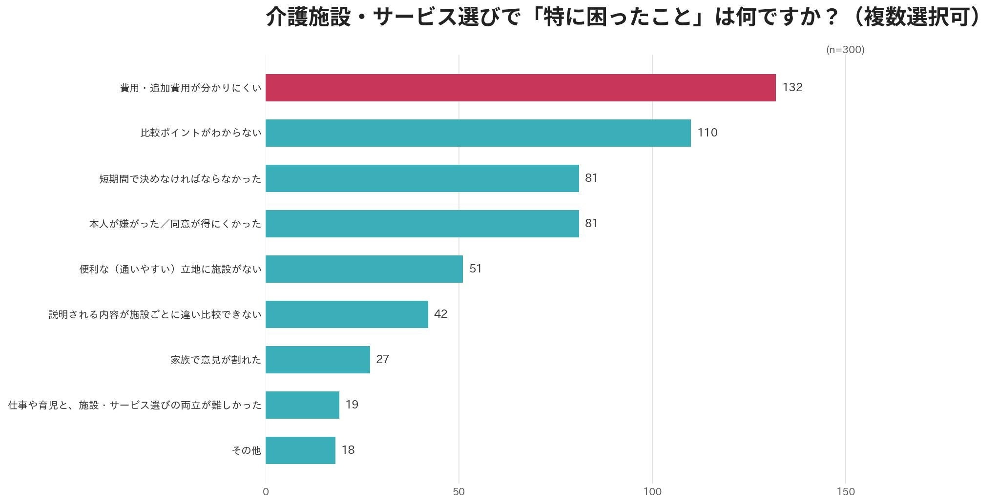 介護施設・サービス選びで「特に困ったこと」を尋ねたところ、「費用・追加費用が分かりにくい」132回答(44.0%)が最も多い結果となりました。「比較ポイントがわからない」110回答(36.7%)が続き、情報の不透明さや判断材料の不足が最大の障壁であることが明らかになりました。