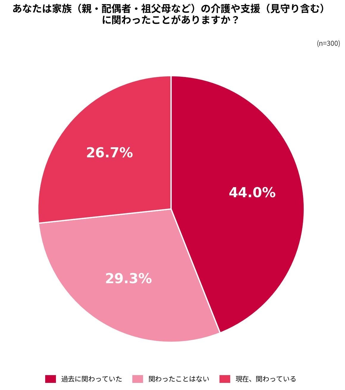 「あなたは家族(親・配偶者・祖父母など)の介護や支援(見守りを含む)に関わったことがありますか?」と尋ねたところ、「過去に関わっていた」が44.0%(132名)でトップ。「現在、関わっている」26.7%(80名)と合わせると、実際に介護に関与した経験者は全体の70.7%に達しました。