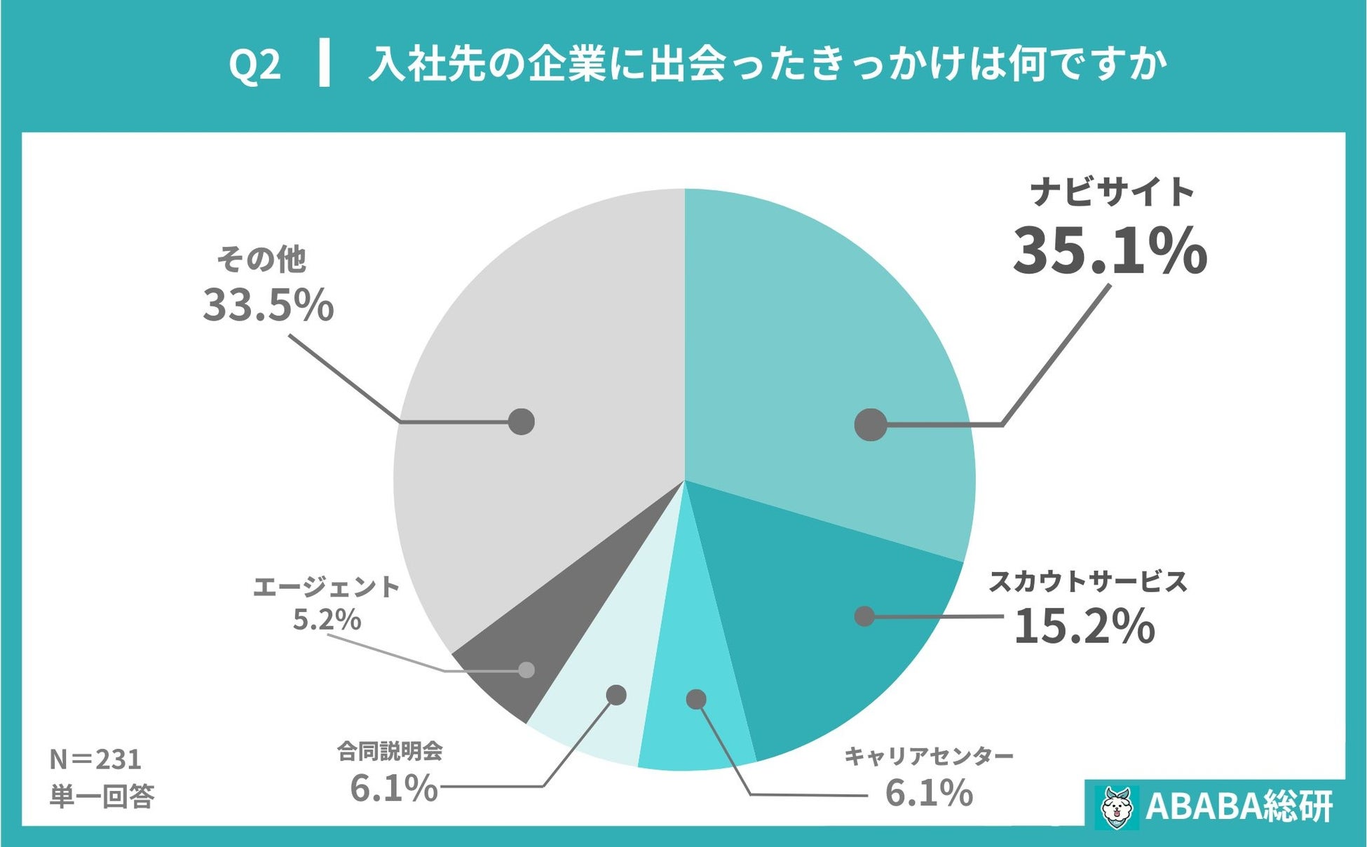 (2)入社先の企業に出会ったきっかけは「ナビサイト」が35.1%で最多。