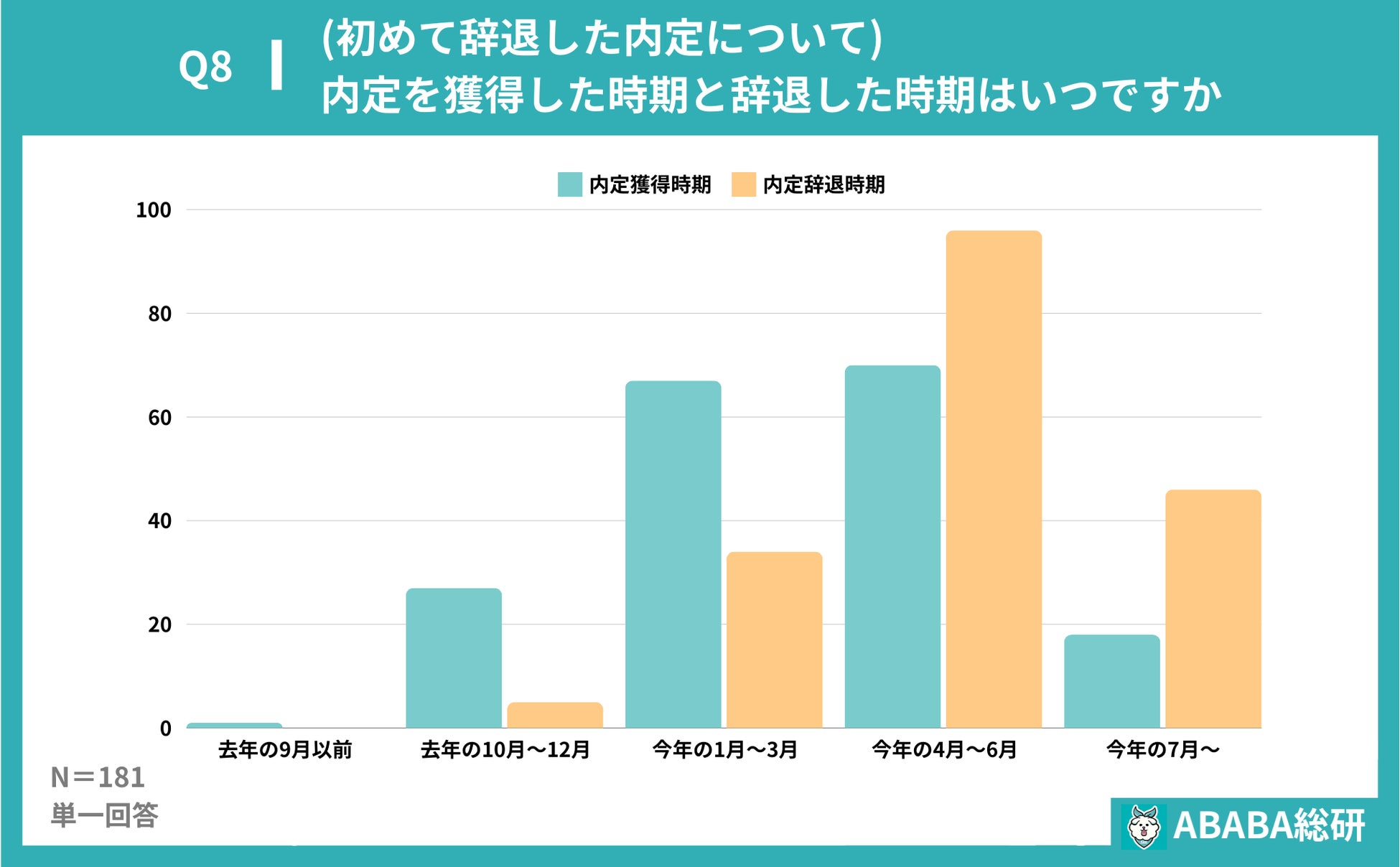 質問:(初めて辞退した内定について)内定を獲得した時期と辞退した時期はいつですか