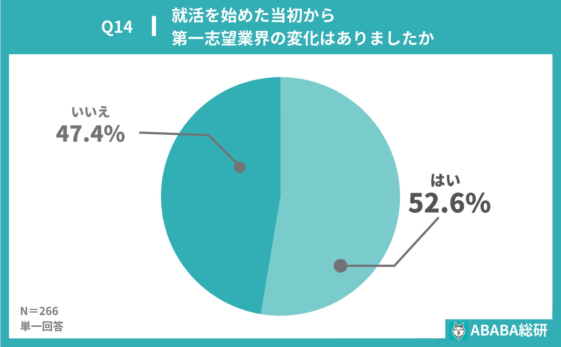 全ての対象者に就活を進める中で第一志望業界に変化があったかを尋ねると「はい」が52.6%、「いいえ」が47.4%となり、ほぼ半々の結果となりました。