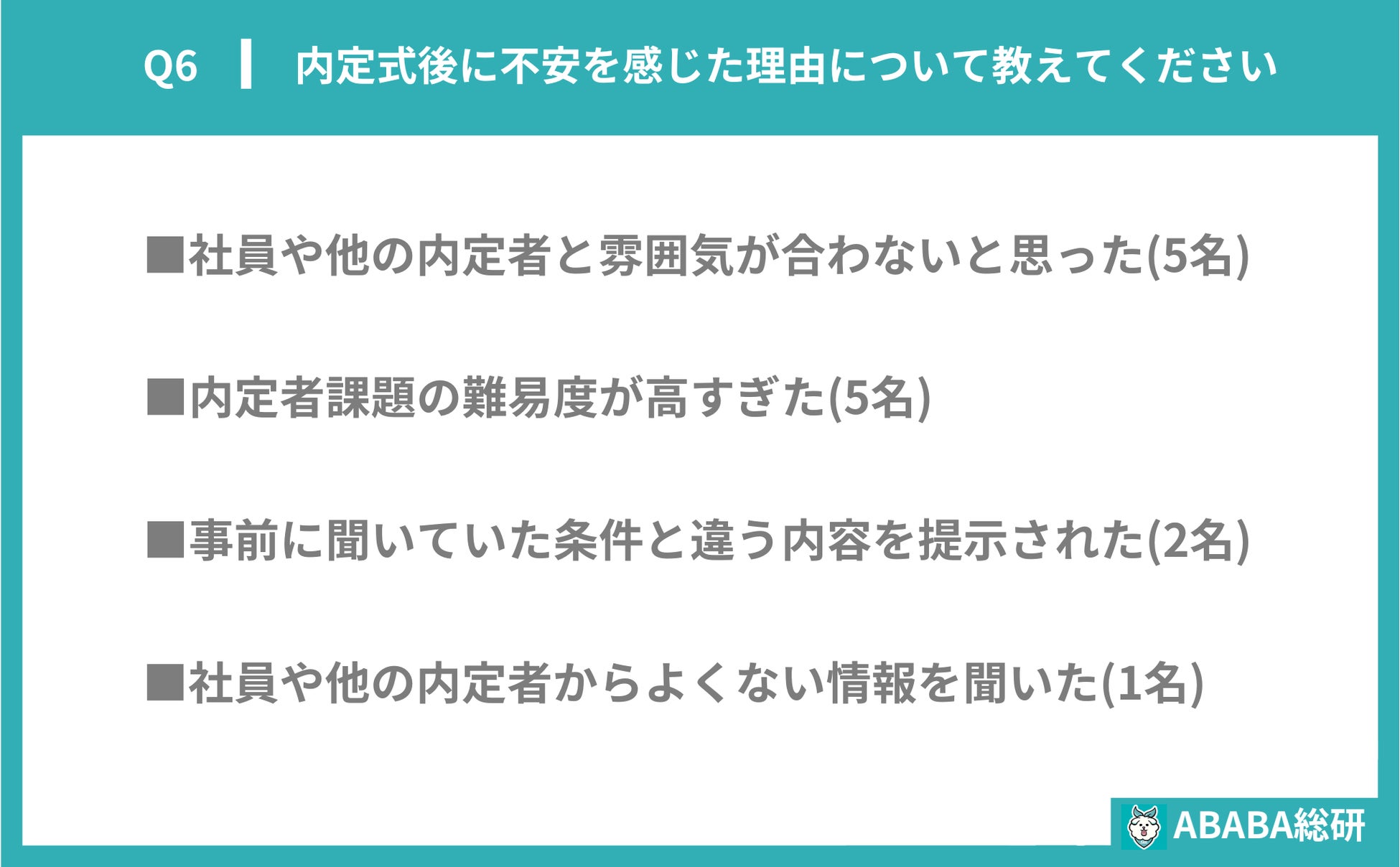 (4)内定式後は「改めてこの会社で頑張ろう」と思った学生が64.1%だった一方で、内定式後に不安を感じた学生も6.8%存在。不安を感じた理由は「社員や他の内定者と雰囲気が合わないと思った」「内定者課題の難易度が高すぎた」など。