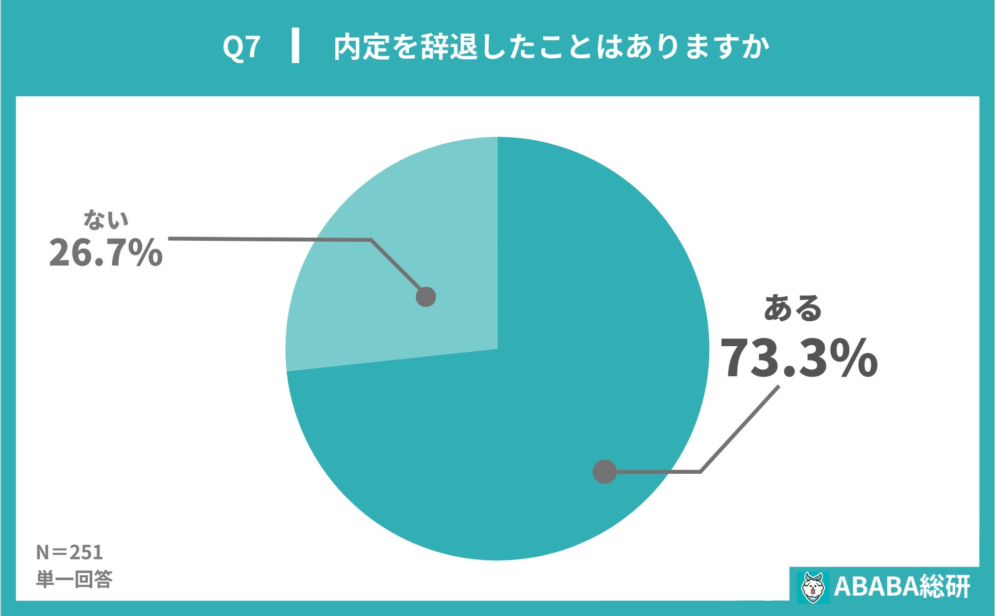 「内定あり」と回答した対象者に内定辞退をしたことがあるかを尋ねたところ、73.3%が「内定を辞退したことがある」と回答しました。