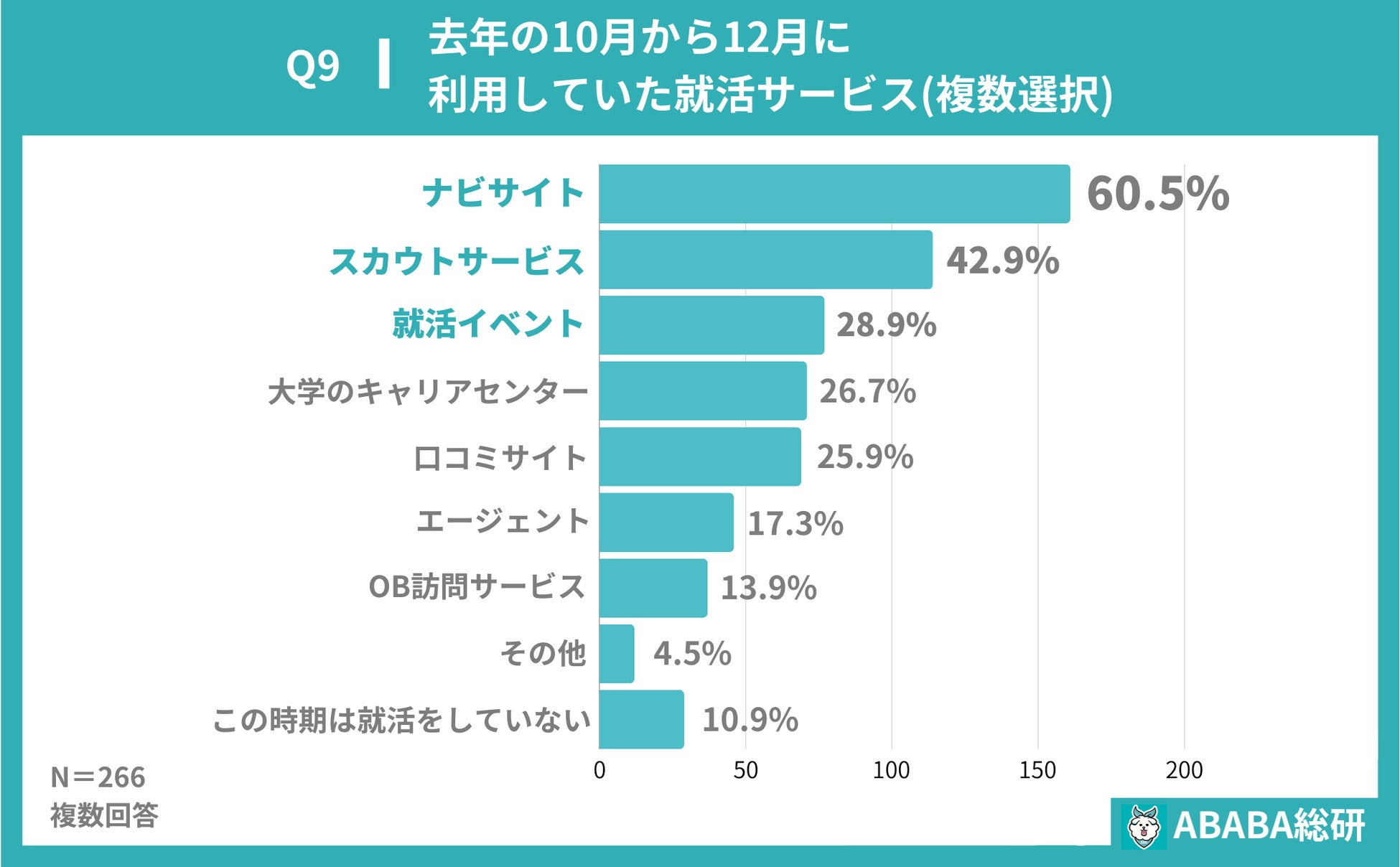 質問:去年の10月から12月に利用していた就活サービスを教えてください(複数選択)
